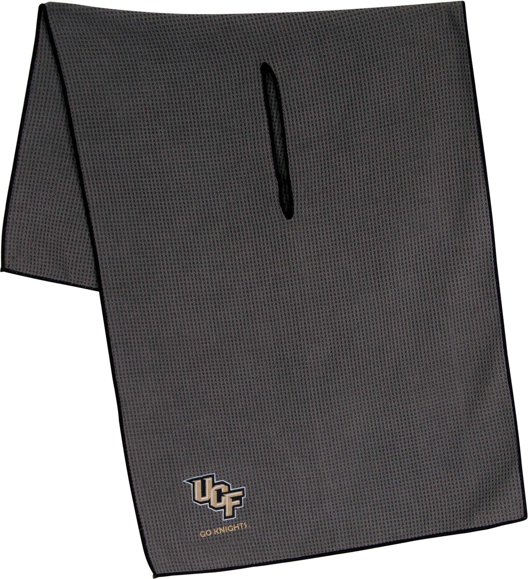 Maintain your clubs as easily as the Knights maintain a lead while using the Team Effort UCF Knights Microfiber Golf Towel. The microfiber waffle-weave construction enables fast and easy club cleaning without damaging the finish. An oversized construction allows you to keep part of the towel wet and part dry for easier cleaning, while a large center slit slides over your clubs for added protection. A boldly embroidered team trademark puts your Knights pride on full display.