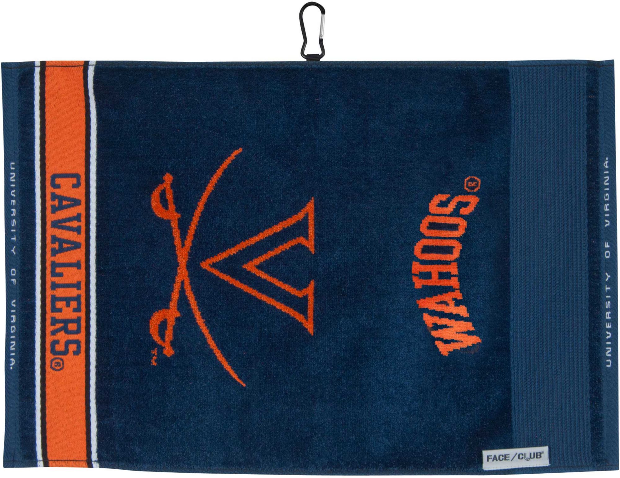 Let your pride in the Cavaliers show through on the course while using the Team Effort Virginia Cavaliers Face/Club Jacquard Golf Towel. Designed to be both absorbent and soft to the touch, this dual-textured golf towel features woven ribs designed to remove dirt from your clubs and a highly absorbent, sheared velour panel to wick away moisture. A carabineer clip located on top secures the towel to your bag or cart for maximum convenience. Eye catching team colors and woven trademarks create an unmistakable Cavaliers look.
