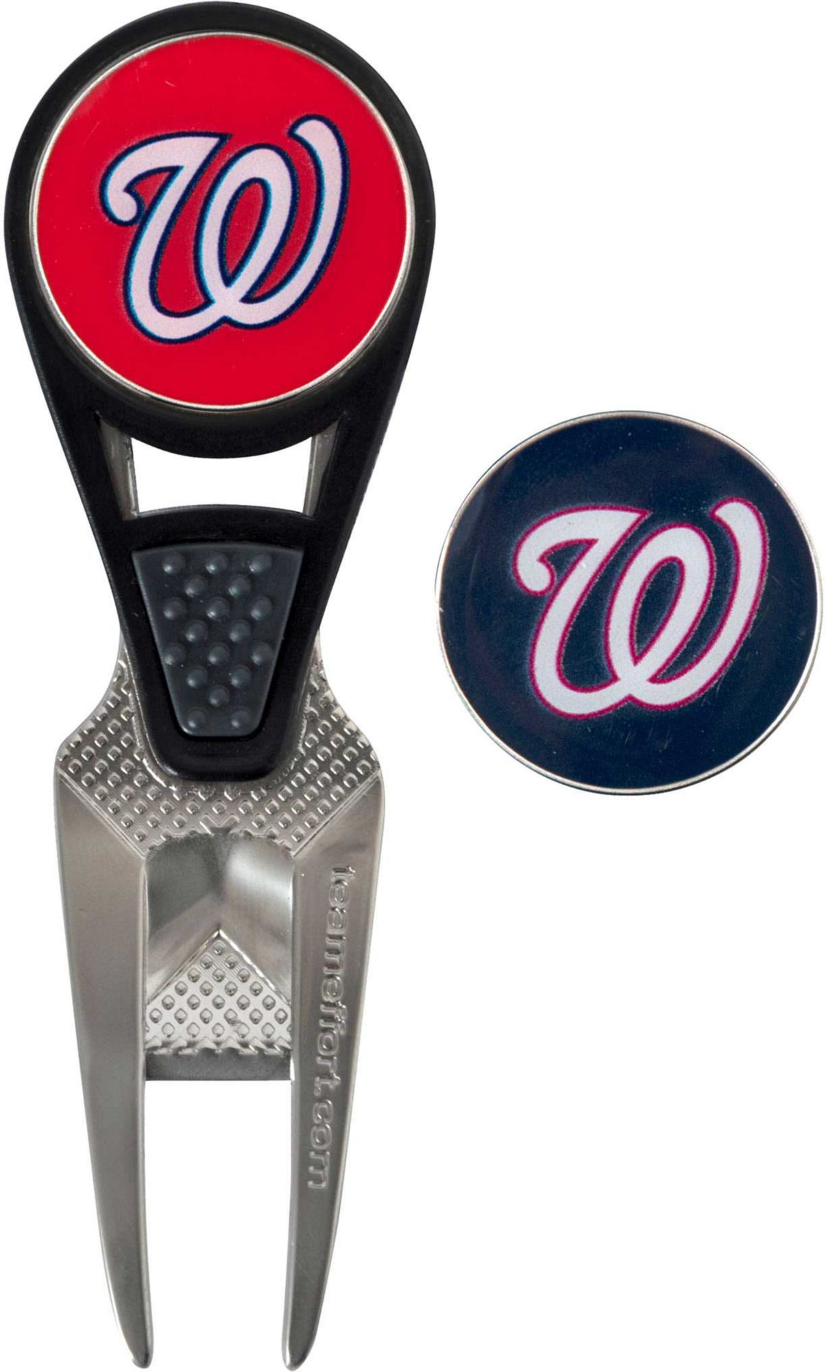 Maintain the green and your sense of Nationals pride with the Team Effort Washington Nationals CVX Divot Tool and Ball Marker Set. The patented CVX tool features an ergonomic construction, custom contoured rails and a textured thumb indent for maximum comfort during use. Two 25mm, iron stamped ball markers feature team trademarks and sit within the magnetic housing on the front of the tool for at hand convenience. Leave no doubt as to your support for the Nationals with this officially licensed divot tool.