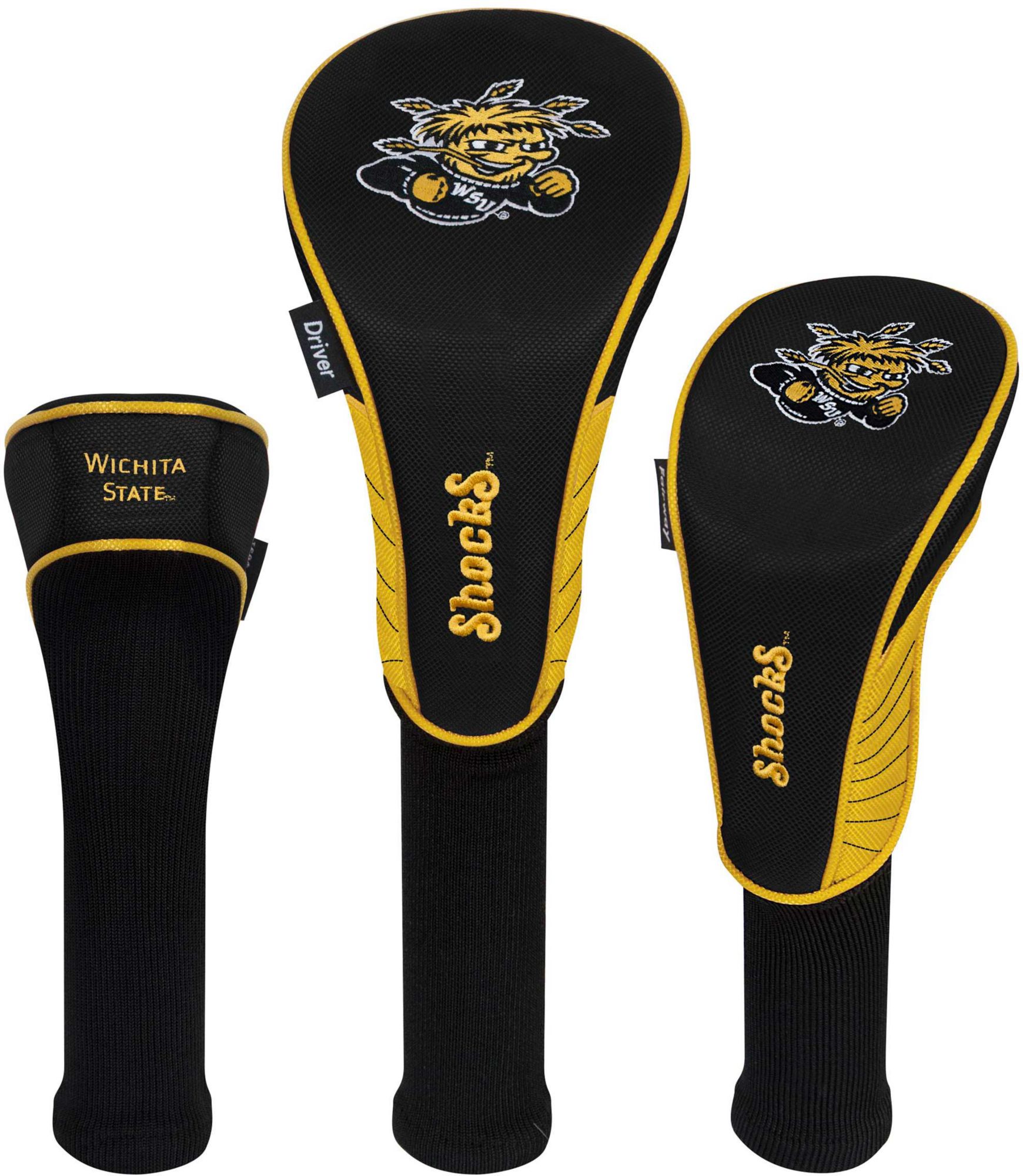 Boldly display your support for the Shockers by protecting your metalwoods with Team Effort Wichita State Shockers Headcovers. Specifically designed to fit most driver, fairway wood and hybrid models, each premium headcover is constructed of rugged 420D nylon material and features a long neck design to deliver maximum club protection. Vibrant, contrasting team color elements combine with multiple team trademark embroideries to show your course mates who back on game day.