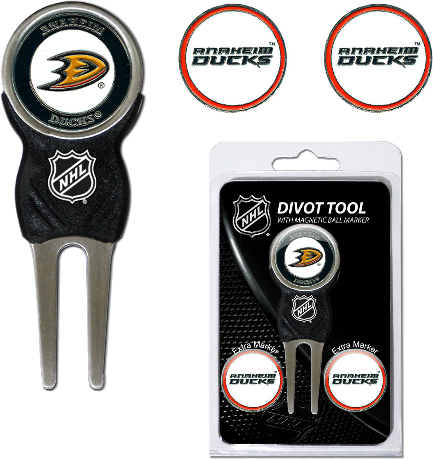 The Team Golf® Anaheim Ducks Divot Tool and Ball Marker Set is a must-have accessory on the course. The set includes a sleek divot tool and three double-sided, enamel, magnetic markers. Each color-filled marker features the official NHL® logo of your favorite team. Show your team spirit on all 18 holes with the Team Golf® Divot Tool and Marker Set.