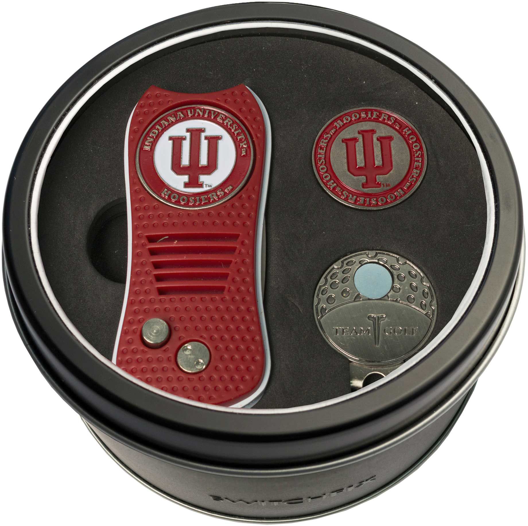 Celebrate your squad by hitting the course with the Team Golf Indiana Hoosiers Switchfix Divot Tool and Cap Clip Set. This unique, easy-to-use divot tool features a soft grooved handle, switchblade-style mechanism and double-sided magnetic ball marker for greenside convenience. A durable cap clip features nickel finish and easily attaches to the brim of your Hoosiers hat to keep your ball marker at hand as you display unmatched team spirit.