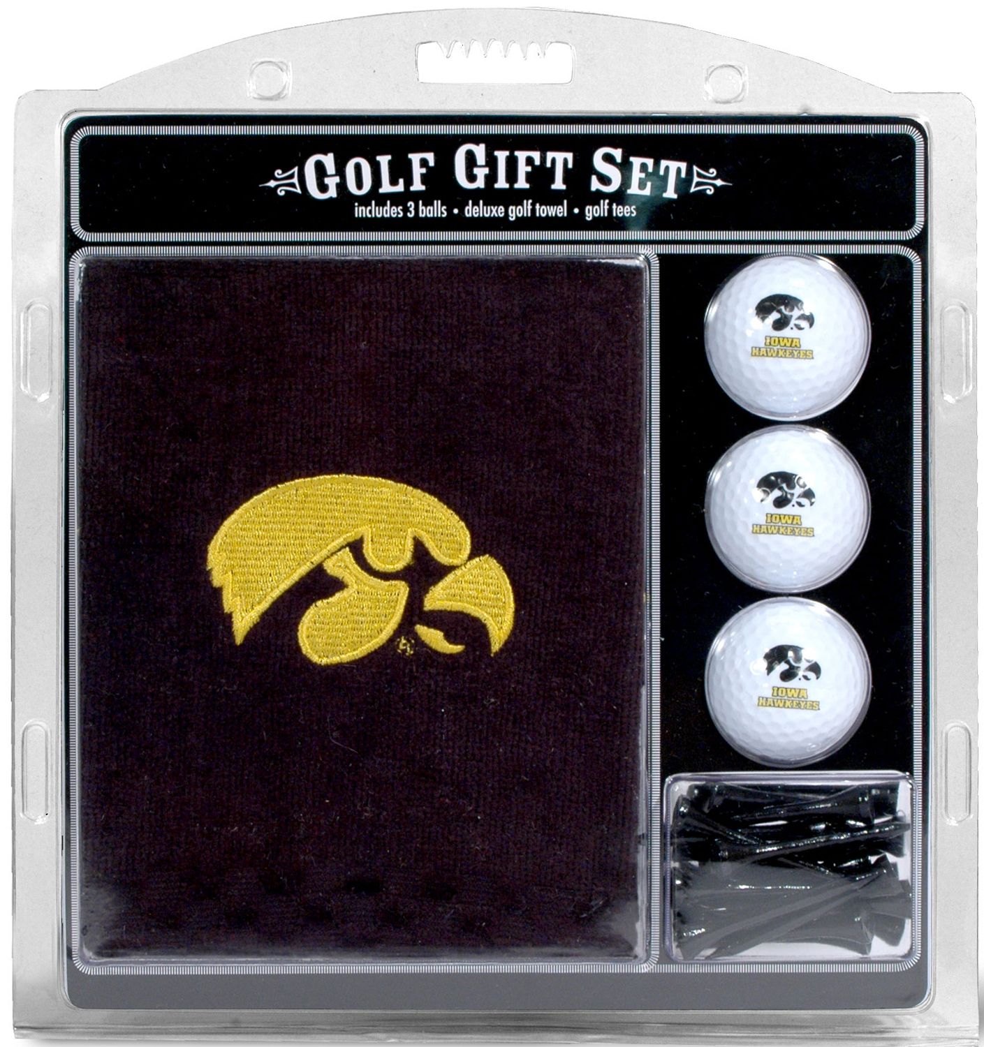 Put some team spirit into your golf game with the Team Golf® Iowa Hawkeyes Embroidered Towel Gift Set. This set includes a tri-fold towel, three regulation golf balls and 12 tees. With embroidered team graphics on the towel, a team logo imprint on each ball and team-colored tees, you will let everyone know that you are an Iowa fanatic. Treat yourself or the Hawkeyes fan in your life to the Team Golf® Embroidered Towel Gift Set.