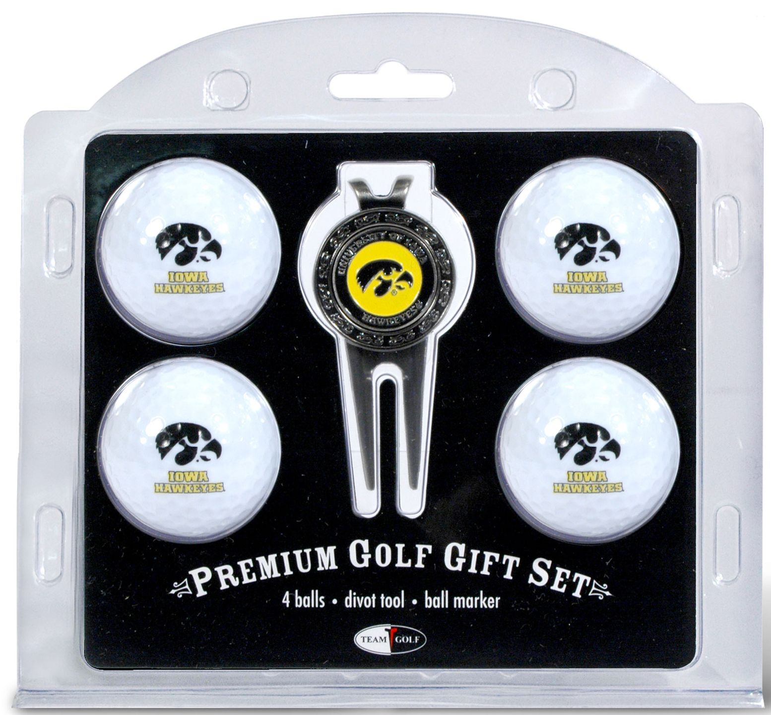 Put some team spirit into your golf game with the Team Golf® Iowa Hawkeyes Four Golf Ball and Divot Tool Gift Set. This gift set includes four regulation golf balls, each with a team logo, a divot tool, and a double-sided, magnetic ball marker with a full color, enamel Iowa design. Gift this set to the Hawkeyes fan you know, or treat yourself to a personalized game with the Team Golf® Golf Ball and Divot Tool Gift Set.
