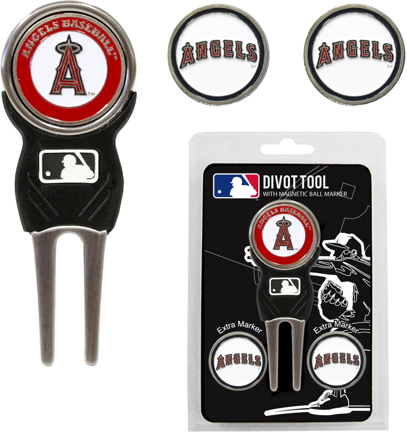 Add some team pride to your game on the green with the Team Golf® Los Angeles Angels Divot Tool and Marker Set. This set includes three double-sided, enamel magnetic markers that feature the team logo and wordmark and a nickel-finished divot tool with the MLB® logo. The magnetic markers are easily removed from and reattach to the divot tool, making it easy to mark your ball. Support your team with this team-inspired set.
