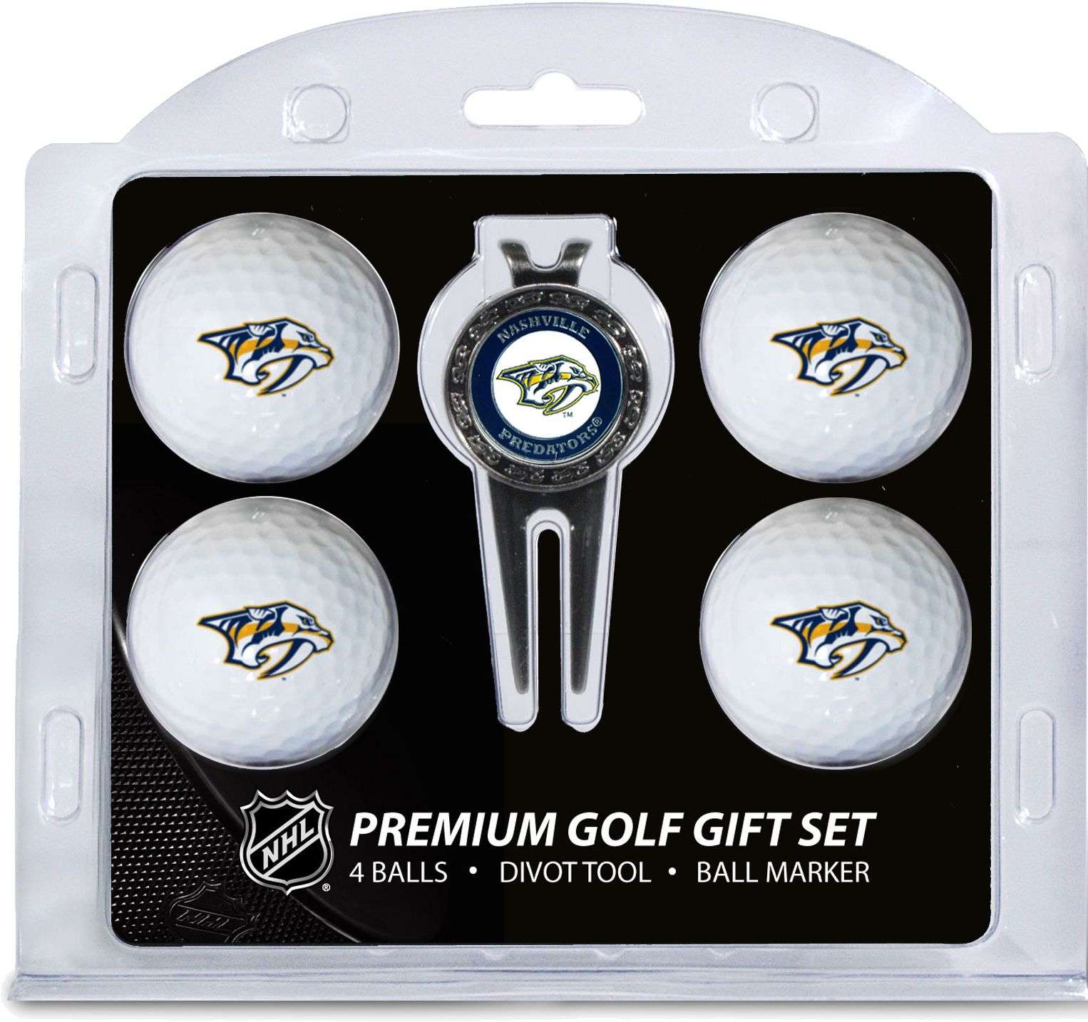 Add some hockey flair to your favorite golfer’s game with the Team Golf® Nashville Predators Premium Golf Gift Set. The set features four golf balls with the team logo, leaving no doubt who the biggest Predators fan is. With a double-sided, magnetic ball marker and divot tool, this gift set has everything a hockey fan needs to hit the links in style. Give the perfect gift with the Team Golf® Premium Golf Gift Set.