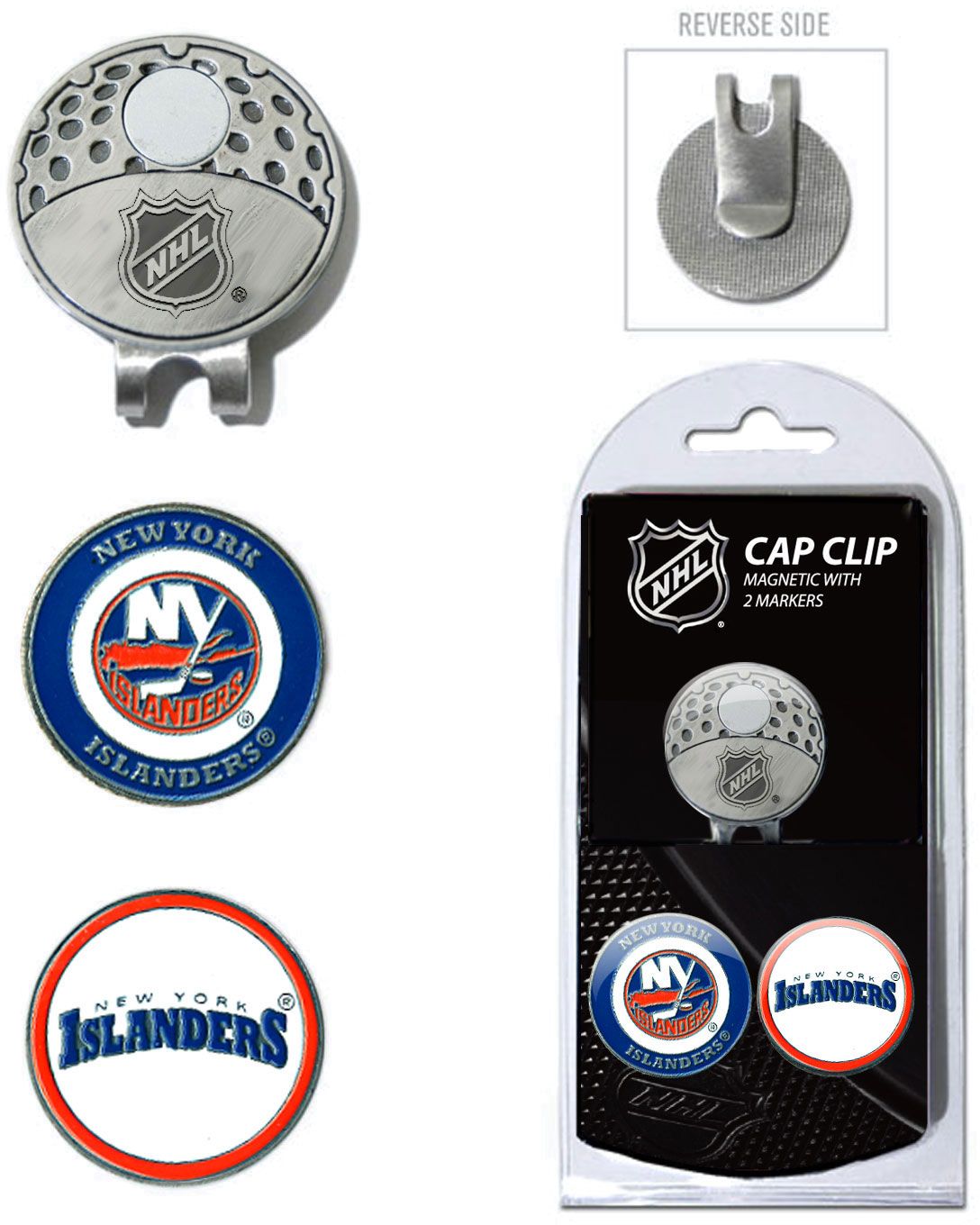 Keep track of your ball markers while showing off your team pride with the Team Golf® New York Islanders Cap Clip and Marker Set. This set includes a nickel-finish cap clip and two double-sided, magnetic ball markers with full color, enamel fill team designs. Personalize your golf game with some Islanders pride when you get the Team Golf® Cap Clip and Marker Set.