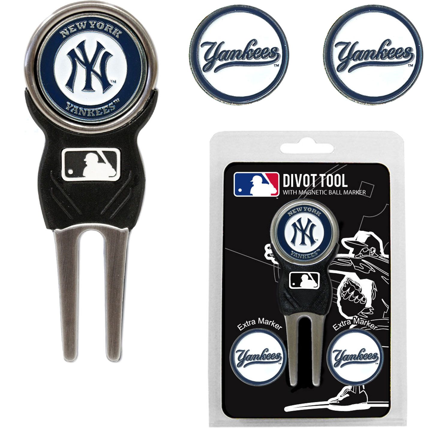 Mark your ball and keep the green clean using the Team Golf® New York Yankees Divot Tool and Marker Set. Three double-sided, enamel magnetic ball markers come with this set adorned with the team logo and wordmark, pronouncing your dedication to the team. The nickel-finished divot tool comes with the MLB® logo, providing a classic look. Conveniently grab you ball marker when needed with the magnetic divot tool attachment.