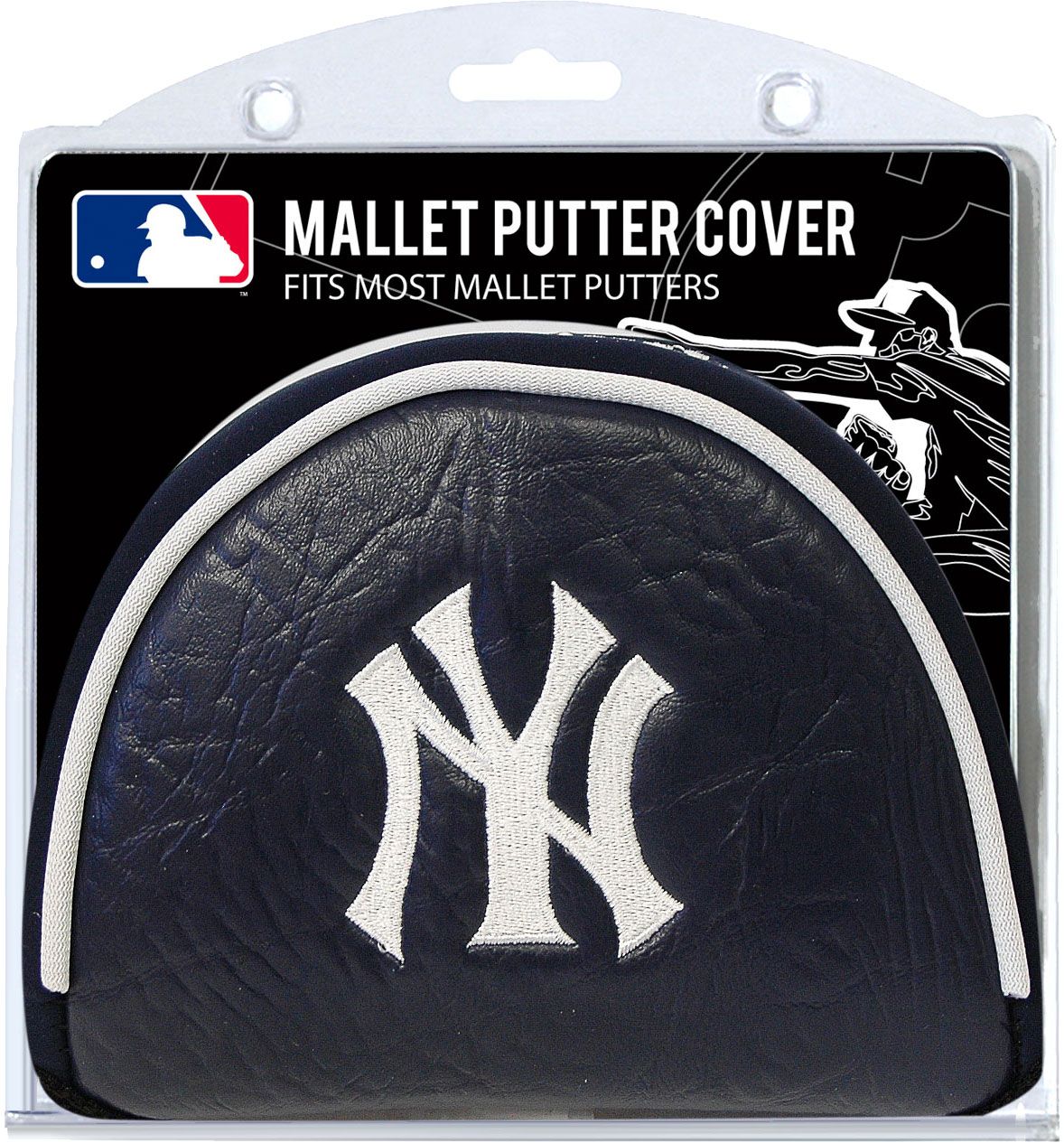 Hit the links with team spirit in your golf bag with the Team Golf® New York Yankees Mallet Putter Cover. This cover features an embroidered Yanks logo with vibrant team colors. The VELCRO® closure and fleece lining provide extra protection to your clubs. Designed to fit most mallet putters, this buffalo vinyl and synthetic suede cover is the perfect addition to your golf accessories.