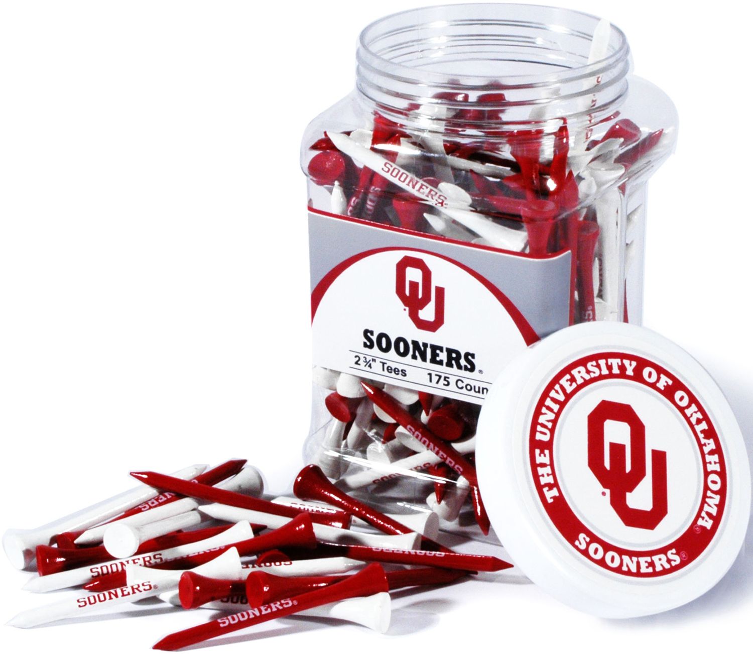 Tee up your next ball with the Team Golf® Oklahoma Sooners 175 Count Golf Tee Jar. This plastic jar contains 175 multi-colored tees, each with a team imprint, so you can show off your team pride on the course. The jar includes a screw-on lid and Oklahoma team labels on the front and on the top. Everyone will know you’re an Sooners fanatic when you get the Team Golf® 175 Count Golf Tee Jar.