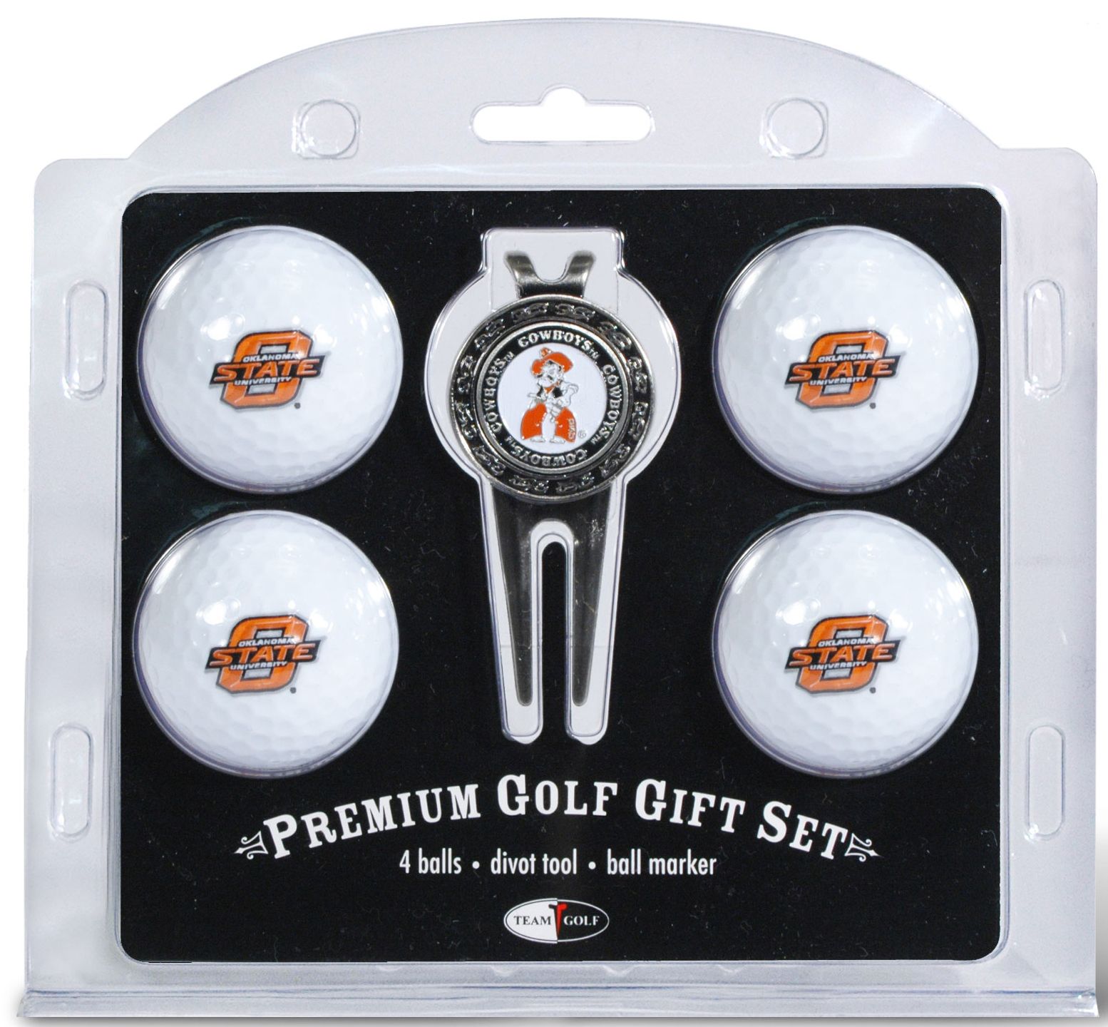 Put some team spirit into your golf game with the Team Golf® Oklahoma State Cowboys Four Golf Ball and Divot Tool Gift Set. This gift set includes four regulation golf balls, each with a team logo, a divot tool, and a double-sided, magnetic ball marker with a full color, enamel Oklahoma State design. Gift this set to the Cowboys fan you know, or treat yourself to a personalized game with the Team Golf® Golf Ball and Divot Tool Gift Set.