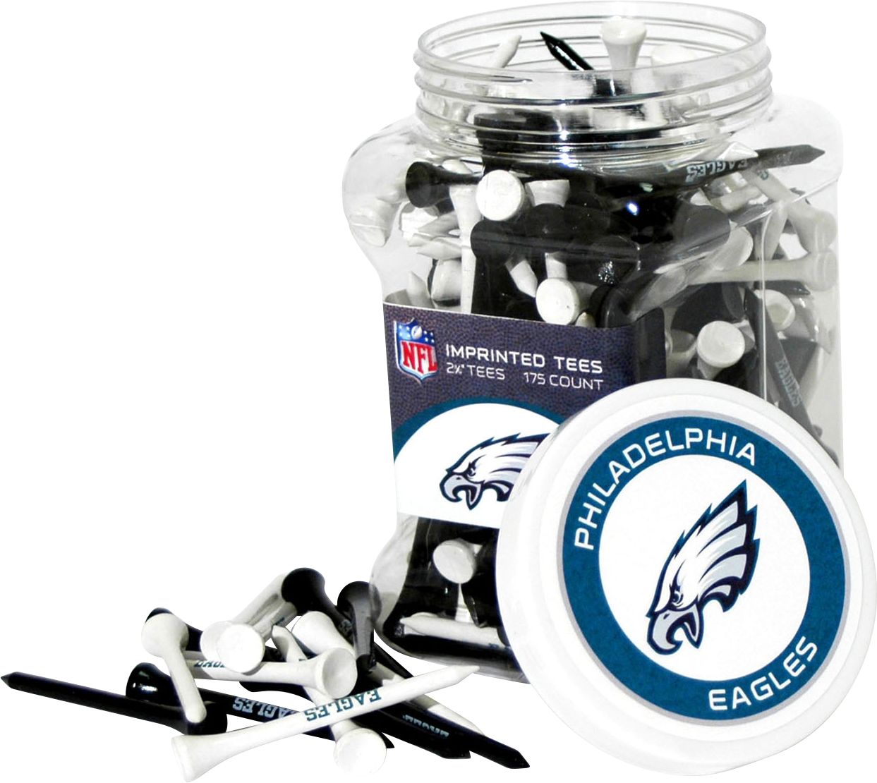 Show your team pride every time you tee off with the Team Golf® Philadelphia Eagles 175-Count Golf Tee Jar. This jar makes a great addition to your office or golf bag as it proudly features your team's colors and logos. Inside the jar are 175 2-3/4" golf tees with team imprints. Reach into the Team Golf® Tee Jar and grab as many as you need for your day on the course.