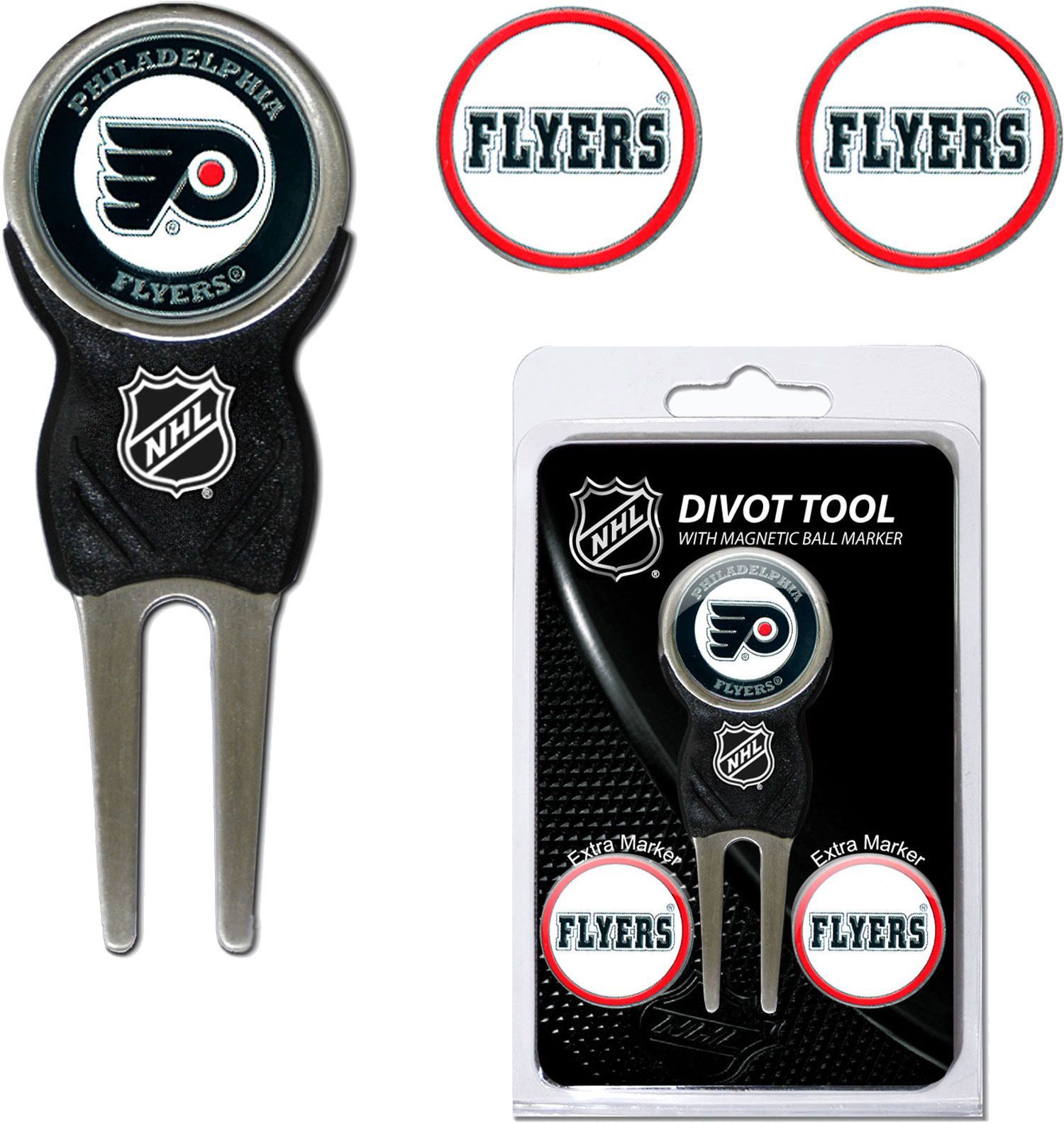 The Team Golf® Philadelphia Flyers Divot Tool and Ball Marker Set is a must-have accessory on the course. The set includes a sleek divot tool and three double-sided, enamel, magnetic markers. Each color-filled marker features the official NHL® logo of your favorite team. Show your team spirit on all 18 holes with the Team Golf® Divot Tool and Marker Set