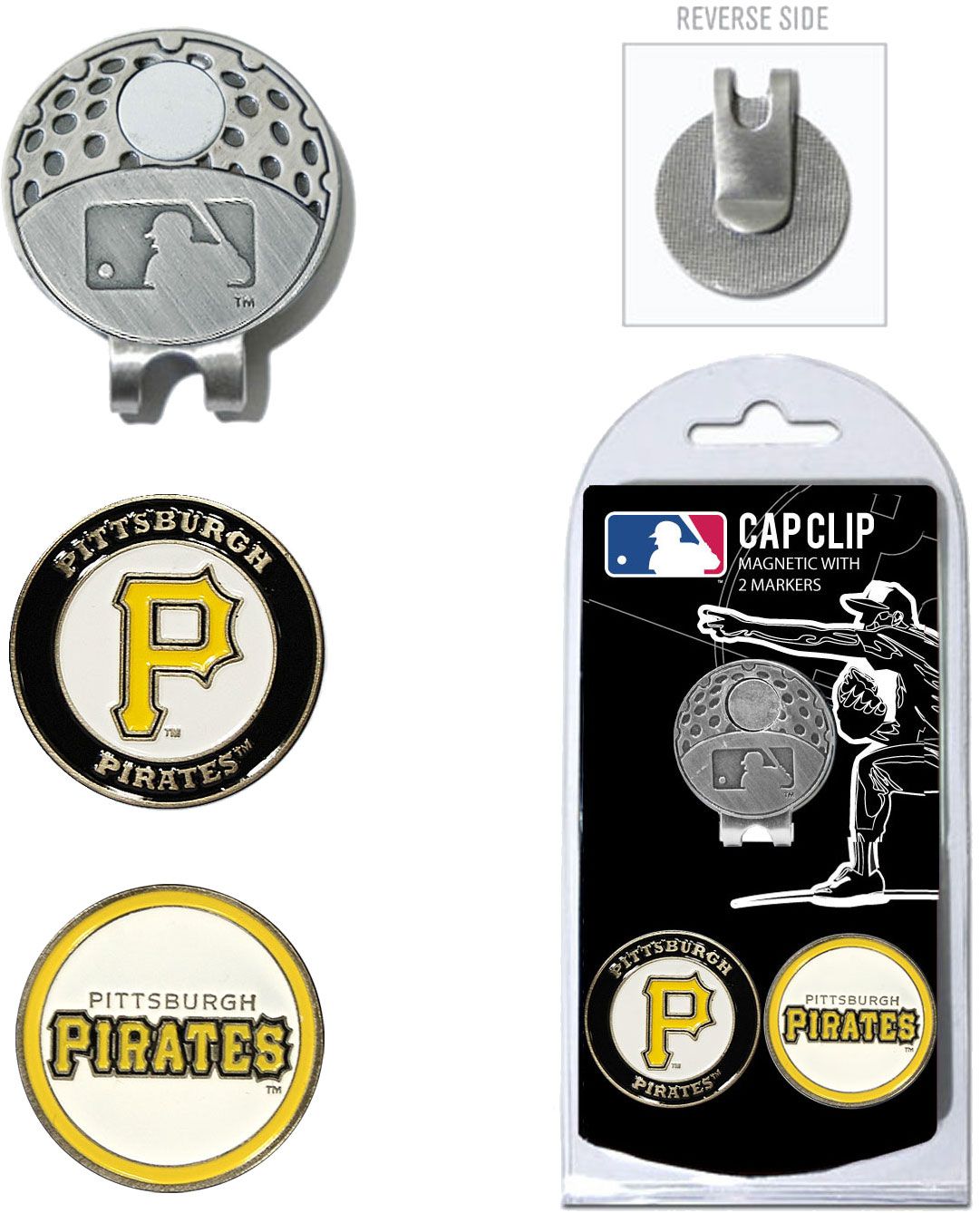 Show your adoration for your baseball team with the Team Golf® Pittsburgh Pirates Cap Clip and Marker Set. This set includes a nickel-finished cap clip that easily attaches to a hat or visor and two double-sided enamel magnetic ball markers. The markers conveniently fit onto the cap clip with the magnetic backing to make it easy to grab when needed. The team colors, wordmark and graphics on the cap clip and ball markers show team pride.