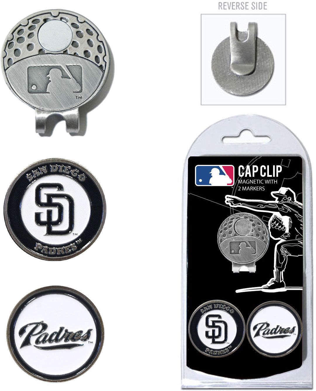 Show your adoration for your baseball team with the Team Golf® San Diego Padres Cap Clip and Marker Set. This set includes a nickel-finished cap clip that easily attaches to a hat or visor and two double-sided enamel magnetic ball markers. The markers conveniently fit onto the cap clip with the magnetic backing to make it easy to grab when needed. The team colors, wordmark and graphics on the cap clip and ball markers show team pride.