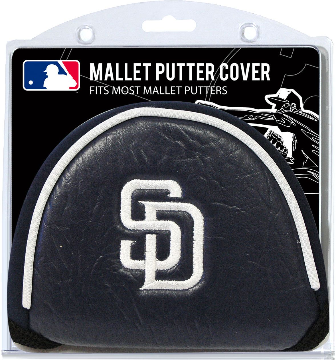 Hit the links with team spirit in your golf bag with the Team Golf® San Diego Padres Mallet Putter Cover. This cover features an embroidered Padres logo with vibrant team colors. The VELCRO® closure and fleece lining provide extra protection to your clubs. Designed to fit most mallet putters, this buffalo vinyl and synthetic suede cover is the perfect addition to your golf accessories.