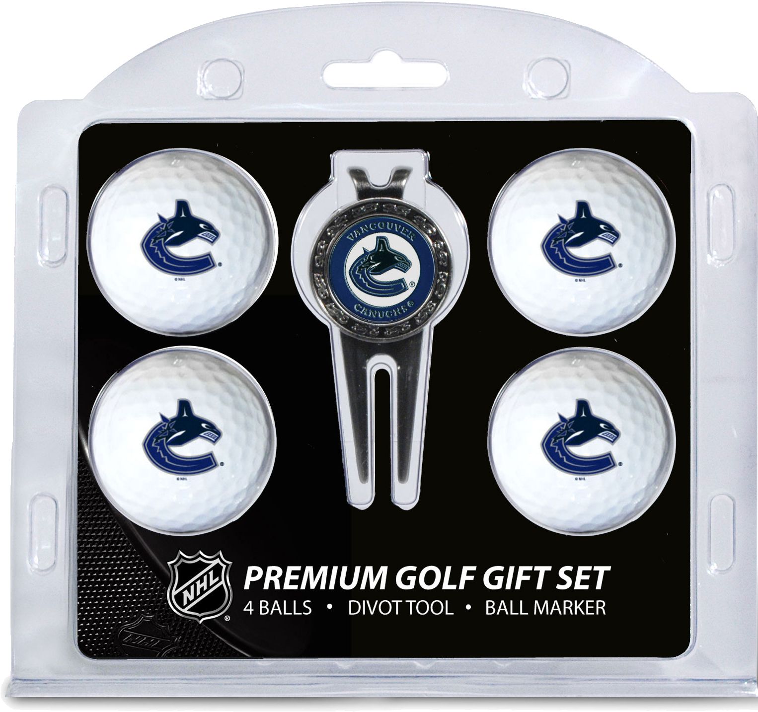 Add some hockey flair to your favorite golfer’s game with the Team Golf® Vancouver Canucks Premium Golf Gift Set. The set features four golf balls with the team logo, leaving no doubt who the biggest Canucks fan is. With a double-sided, magnetic ball marker and divot tool, this gift set has everything a hockey fan needs to hit the links in style. Give the perfect gift with the Team Golf® Premium Golf Gift Set.