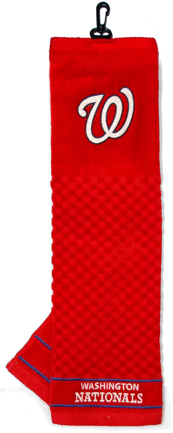 Keep your golf balls and clubs clean with team spirit when you use the Team Golf® Washington Nationals Embroidered Golf Towel. The embroidered team logo on this 16” x 22” cotton towel shows everyone on the course your favorite baseball team. The black swivel clip makes it easy to attach to your golf bag, and the scrubber pattern quickly cleans your clubs and balls. Hit an ace with this tri-fold golf towel.
