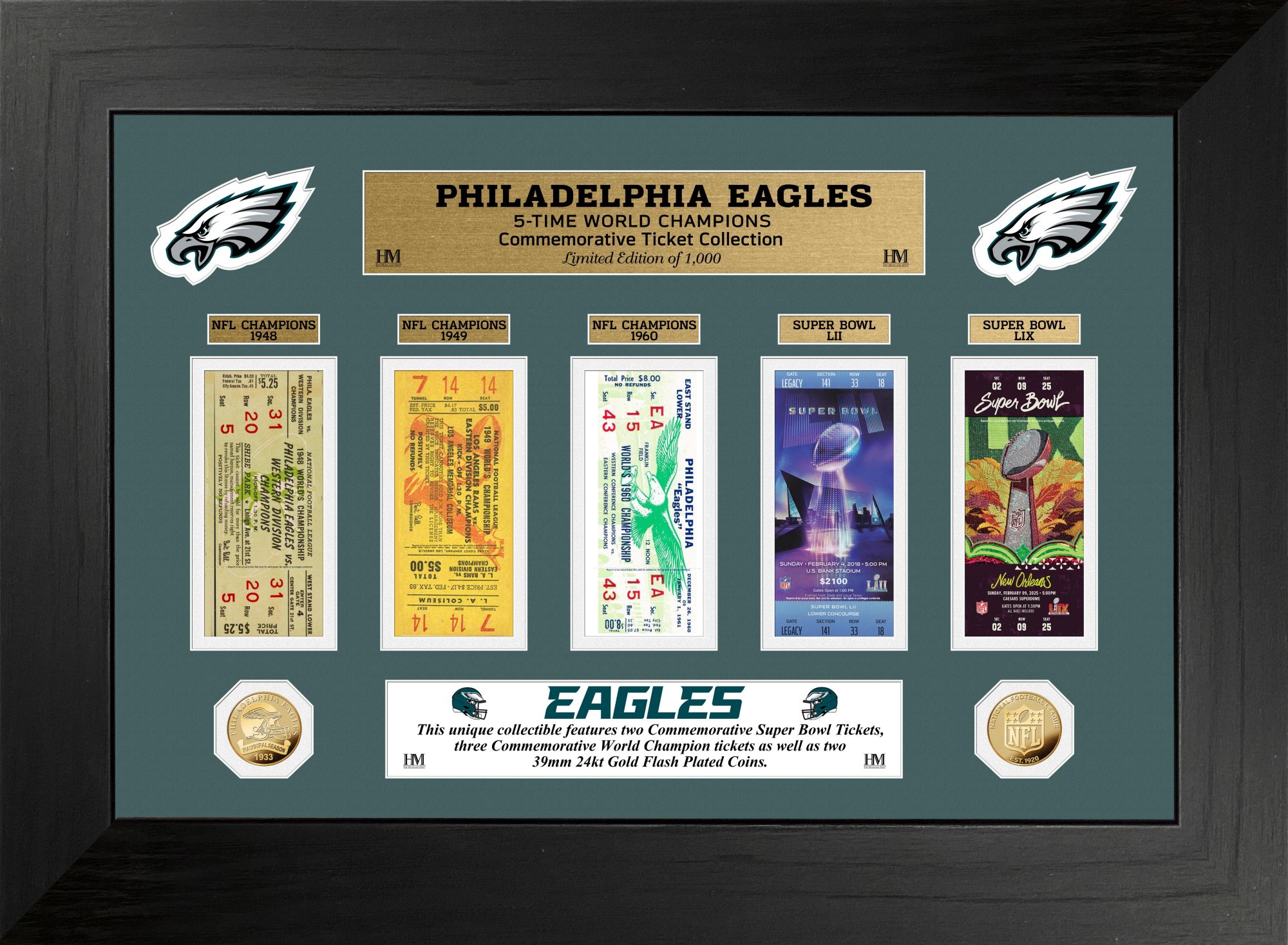 Five tickets are matted with a minted Gold plated Philadelphia Eagles Coin and a Gold plated NFL Coin each measuring 39mm in diameter. Also matted in the frame are engraved nameplates and die cut team logos