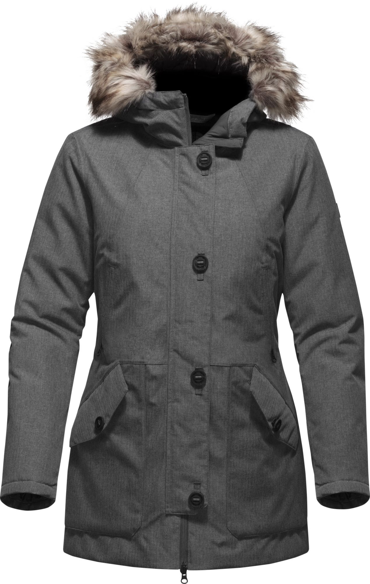 A classic winter parka with a military chic touch, The North Face® Mauna Kea Parka will keep you warm in style this cold weather season. Bundle up with goose down and Heatseeker™ insulation while fully taped seams ensure the elements stay out. Adjust the waist to flatter your figure while the removable faux fur brim creates a versatile style. Winter never looked better in The North Face® Mauna Kea Parka.