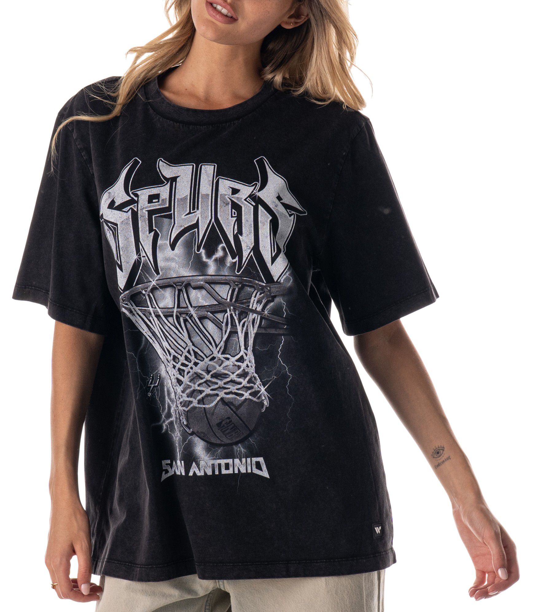 Stand out on game day with this tonal tee. Featuring a bold logo graphic and distressed black wash, it’s an easy piece to rep your team with edge. Perfect for layering or wearing solo, this T-shirt turns game-day essentials into everyday statements—crafted for the fan who leads with style and loyalty.