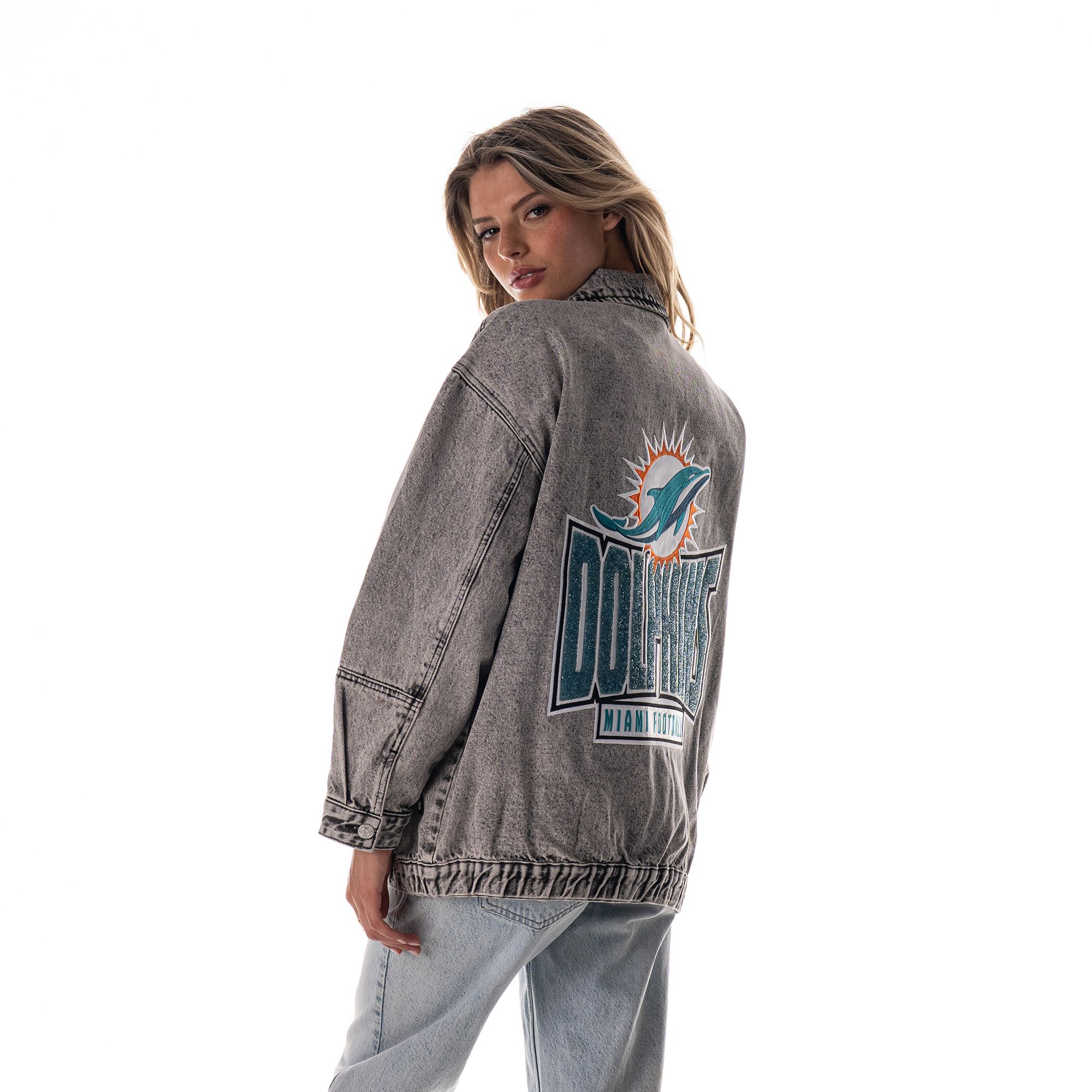 The Wild Collective Women's Miami Dolphins Grey Denim Crystal Rock Denim Jacket