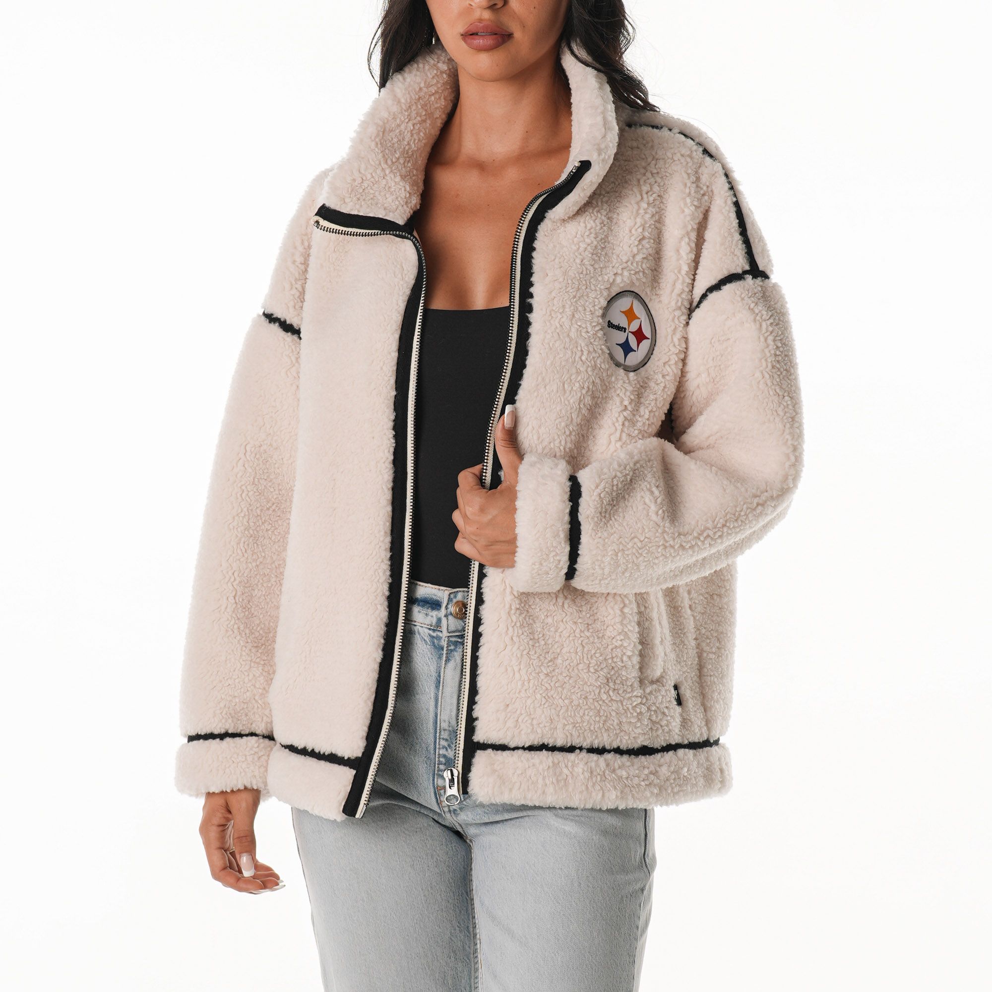 The Wild Collective Women's Pittsburgh Steelers Natural Taping Sherpa Jacket