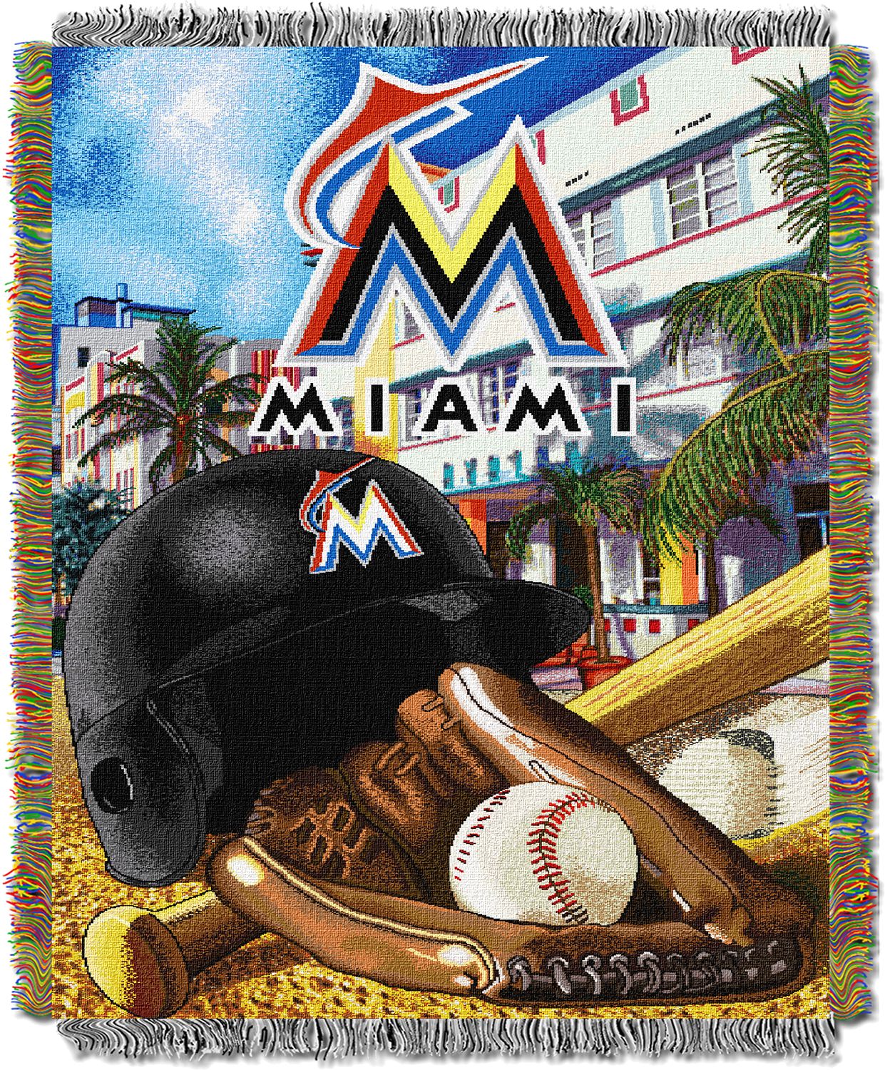Get the decoration your fan cave’s been missing with the TheNorthwest® Miami Marlins Home Field Advantage Blanket. The eye-catching baseball images featured at the forefront with the Miami-themed background shows your unbeatable passions for the team. Measuring 46” x 60”, this throw is a great size for snuggling with on the couch or for hanging up on a wall. Cover up and show you team fandom with this woven blanket.