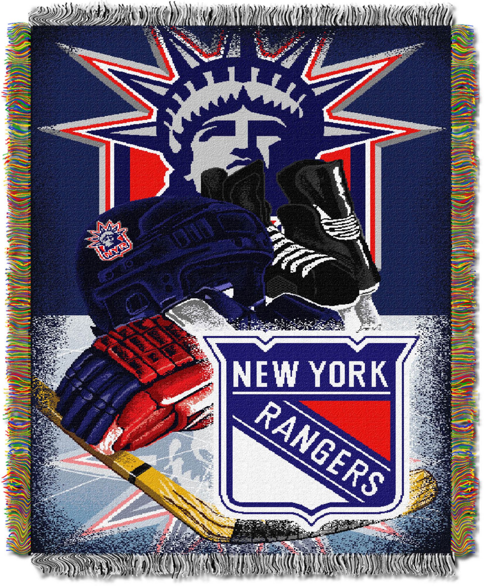 Stay warm or give your home a true fan look with a TheNorthwest® New York Rangers Home Ice Advantage Tapestry Throw Blanket. This woven tapestry throw blanket is made from 100% acrylic fabric and measures 48” x 60”. The graphic on the front has two large Rangers logos in the background along with hockey equipment in the foreground to show your hardcore hockey fandom. The throw is made from durable and machine washable woven fabric.