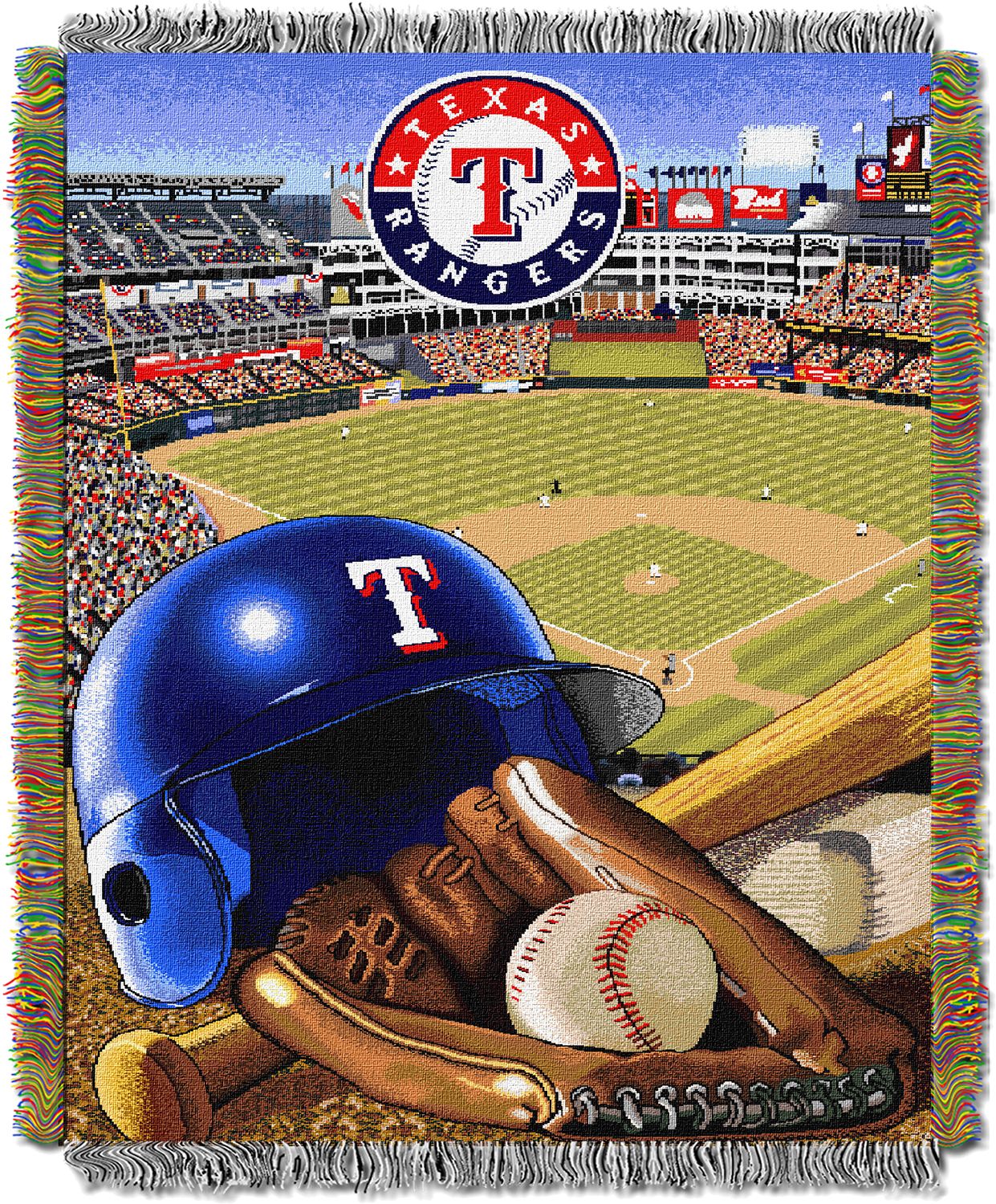 Get the decoration your fan cave’s been missing with the TheNorthwest® Texas Rangers Home Field Advantage Blanket. The eye-catching baseball images featured at the forefront with the Texas-themed background shows your unbeatable passions for the team. Measuring 46” x 60”, this throw is a great size for snuggling with on the couch or for hanging up on a wall. Cover up and show you team fandom with this woven blanket.