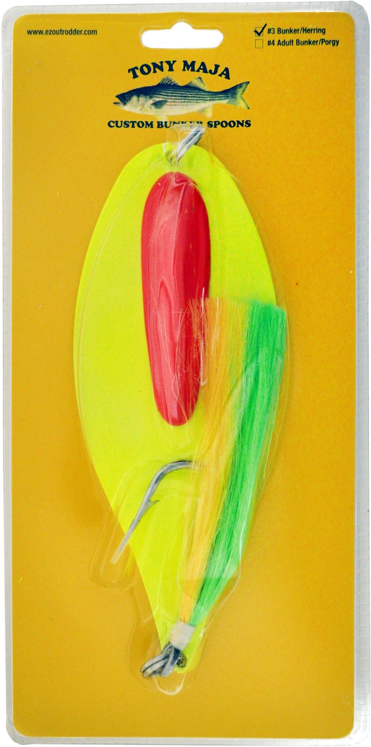 Ready for immediate use right out of the package, the Tony Maja #3 Bunker/Herring Spoon is ideal for trolling in any conditions. Strategically designed to have a more life-like swimming action, Tony Maja spoons have a higher hook up ratio with hardly any foul hook-ups. The mustad 9/0 stainless steel bucktail hook speaks to the quality of the #3, and the heavier weight allows it to work at a greater depth than other spoons.