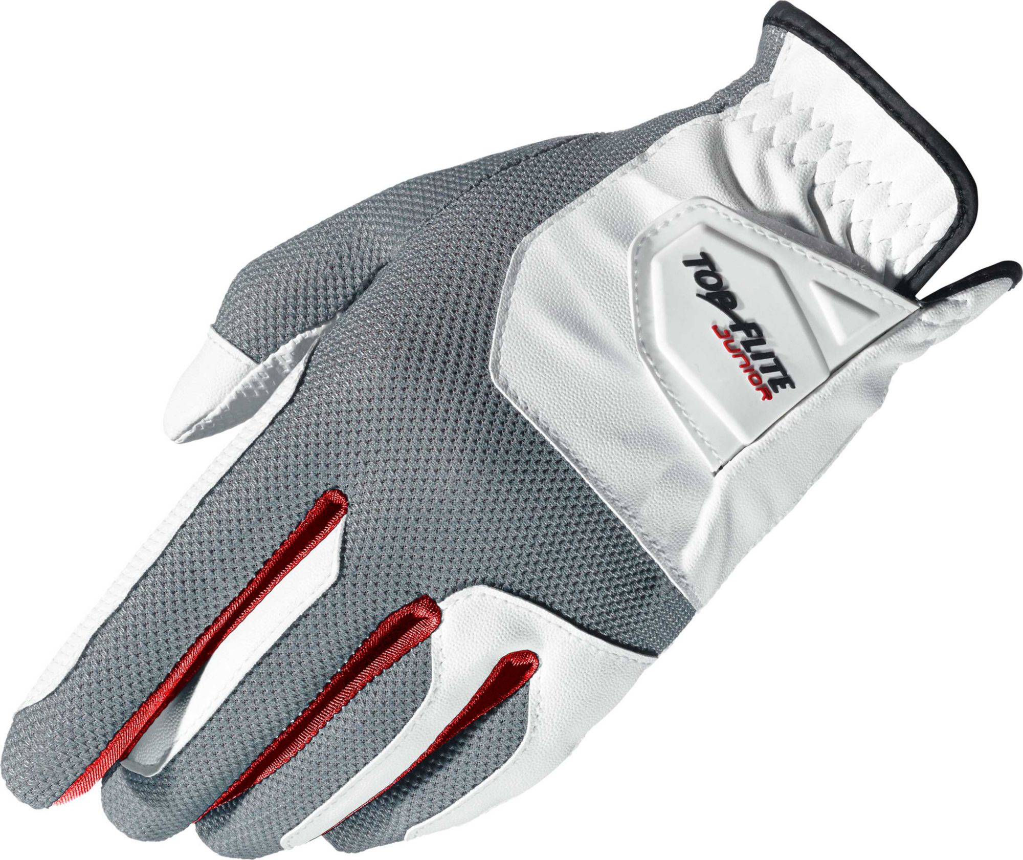 Equip your youngster for comfort on the course with a Junior Golf Glove. A synthetic leather construction features digitized palm texture elements to deliver excellent grip and control in any conditions. Strategically placed Lycra® material enhances breathability while providing consistent fit. Comfortable wrist elastic elements and a hook-and-loop angled tab closure combine to create a locked in fit with the Top Flite® Junior Golf Glove.
