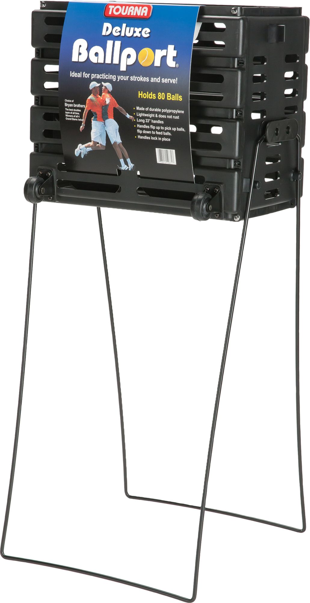 Able to be used as a traveling case on the go or a stationary container during practice, the Tourna® Ballport Deluxe with Wheels holds up to 80 tennis balls for interruption-free training sessions to develop your serve and shot.