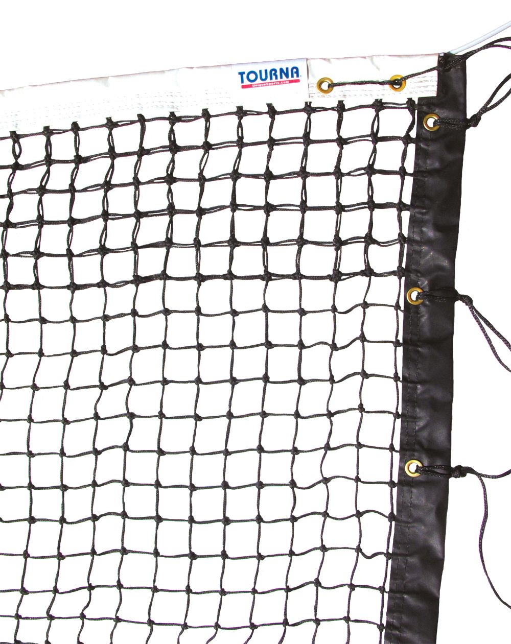 Durably tapered and double braided, the Tourna® Double Braided Tennis Net is ultra-sturdy and offers less contact with the ground. Trimmed with black tape on the sides and bottoms, this net features a strong 6 mm steel cable and thick, fiberglass side sticks. The vinyl headband and polyester stitching inhibits warping damage caused by UV rays and mildew, making this one tough tennis net.