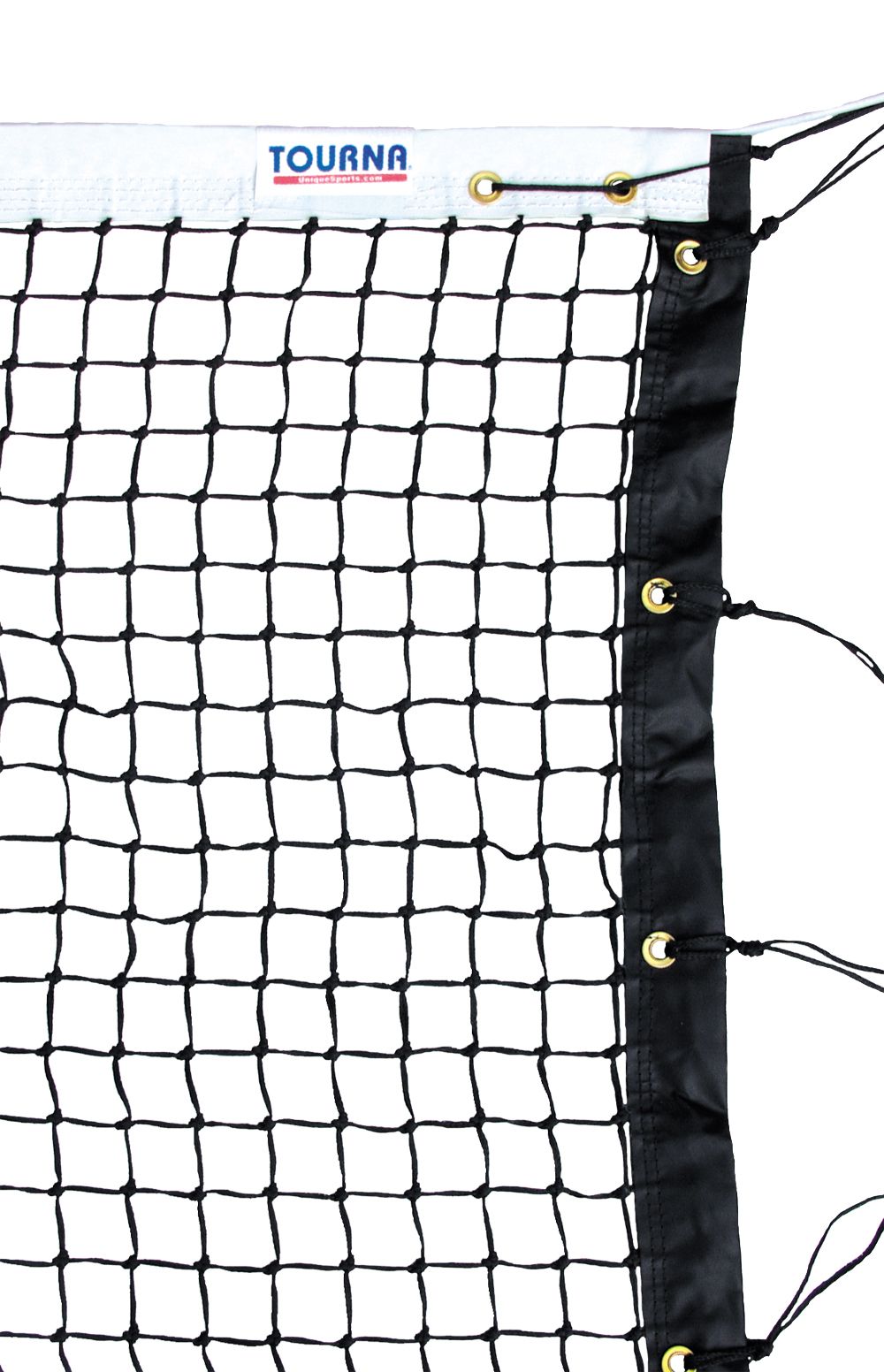 Durably tapered and single braided, the Tourna® Single Braided Tennis Net is ultra-sturdy and offers less contact with the ground. Trimmed with black tape on the sides and bottoms, this net features a strong 6 mm steel cable and thick, fiberglass side sticks. The vinyl headband and polyester stitching inhibits warping damage caused by UV rays and mildew, making this one tough tennis net.