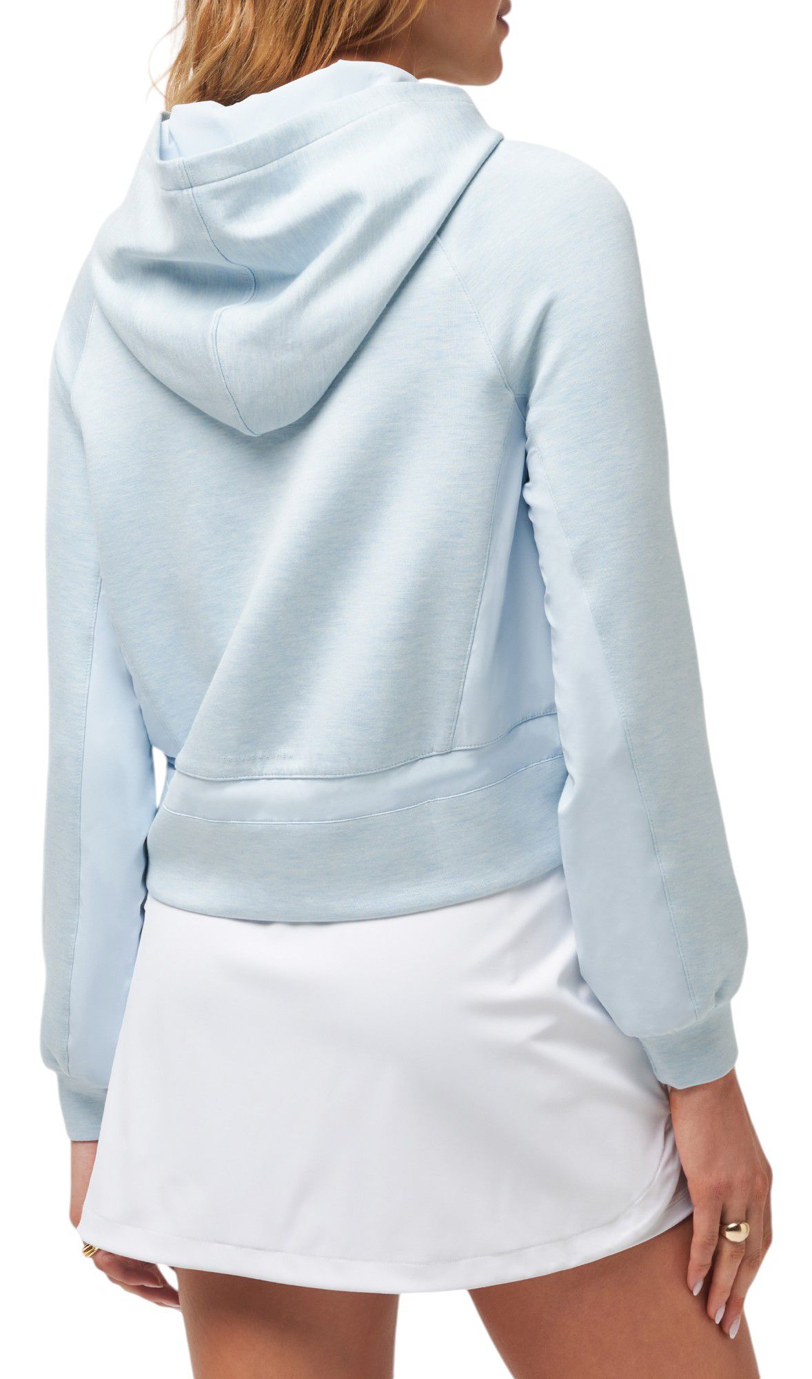I saw this online and had no intention of purchasing it. I saw it in store, where it was styled differently, and i loved it. I wear it with the waist tie loose. It is a super soft, well-made golf hoodie that is more stylish than most. I love mine.