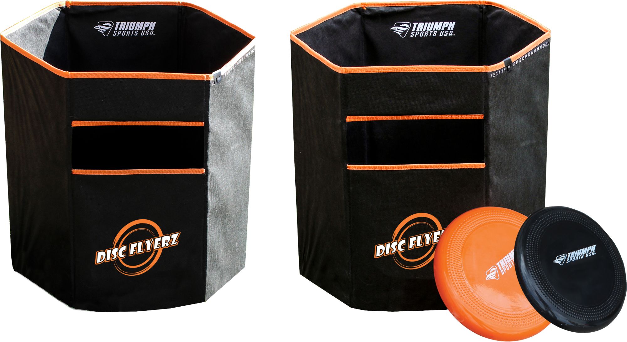 Take outdoor fun to new heights with the simple and competitive Disc Flyerz Disc Toss Game Set. The objective of this game is to throw your disc towards the hexagonal can to score points. The included cans are collapsible for convenient storage and equipped with easy-to-read slide scoring systems. In addition, this set includes 2 plastic flying discs. A carry bag makes transporting the Triumph® Disc Flyerz Disc Toss Game Set a breeze.