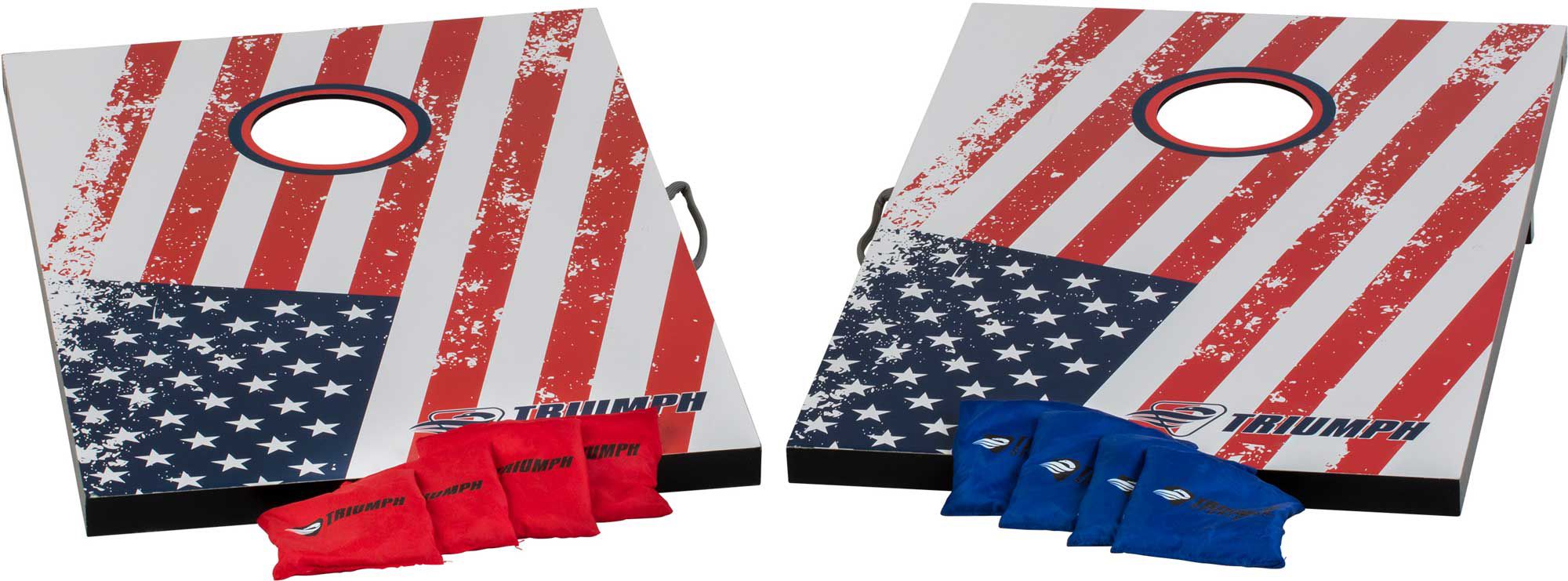 Perfect for your next BBQ or tailgate, the Triumph Stars and Stripes 2’ x 3’ Bean Bag Toss is fun for the whole family. This bean bag toss game includes two sturdy MDF bean bag toss boards as well as eight bean bags in two colors to easily differentiate between teams. The boards feature integrated carrying handles, making transport quick and easy.