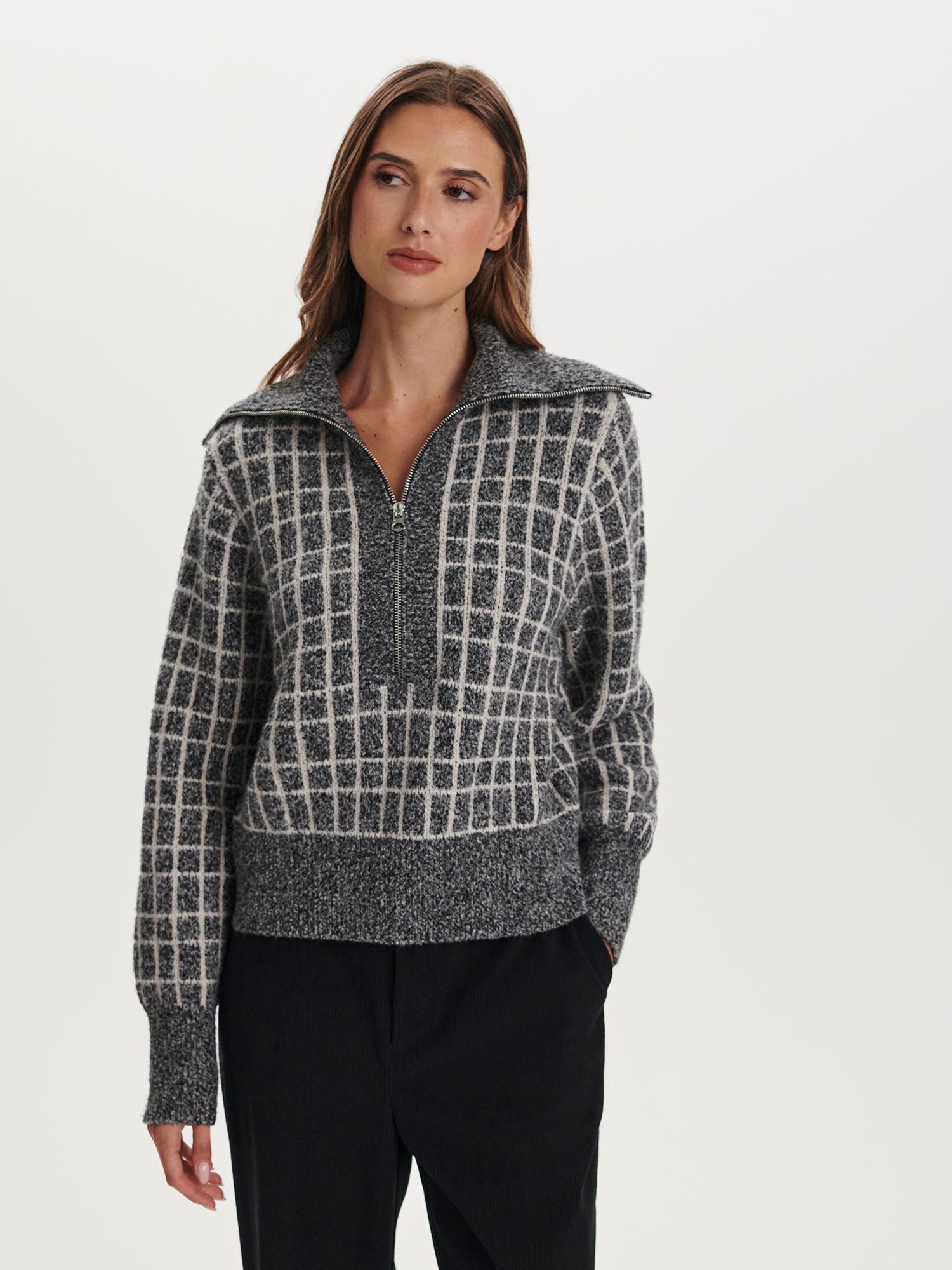A classic half-zip knit with elevated design details, the Furley features a turn-back collar and an elegant checkered pattern. Crafted from our Plush Bouclé Check Jacquard, the Furley has a super soft handfeel.