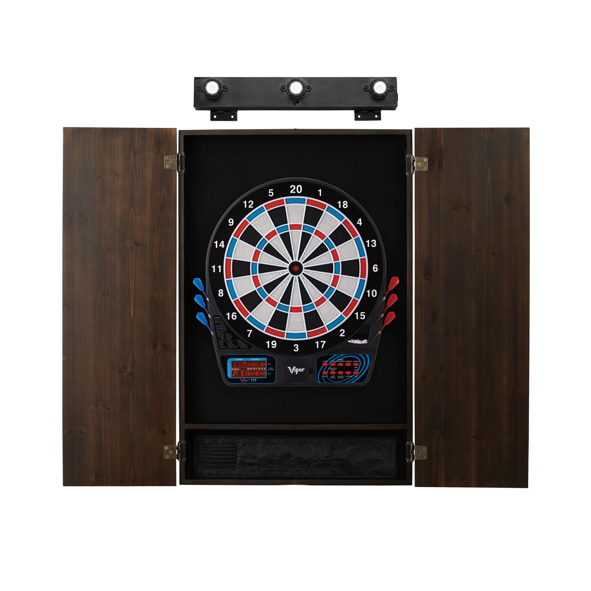 With everything you need to start up a game of darts in one convenient package, the Viper 777 Electronic Dartboard and Cabinet Bundle will elevate your game room. This bundle includes a Viper 777 Electronic dartboard, which allows up to 8 players to play 26 different games! The Metropolitan Espresso cabinet has a classic look, keeping your dartboard and accessories safe, with style. Includes board, cabinet, and board light.