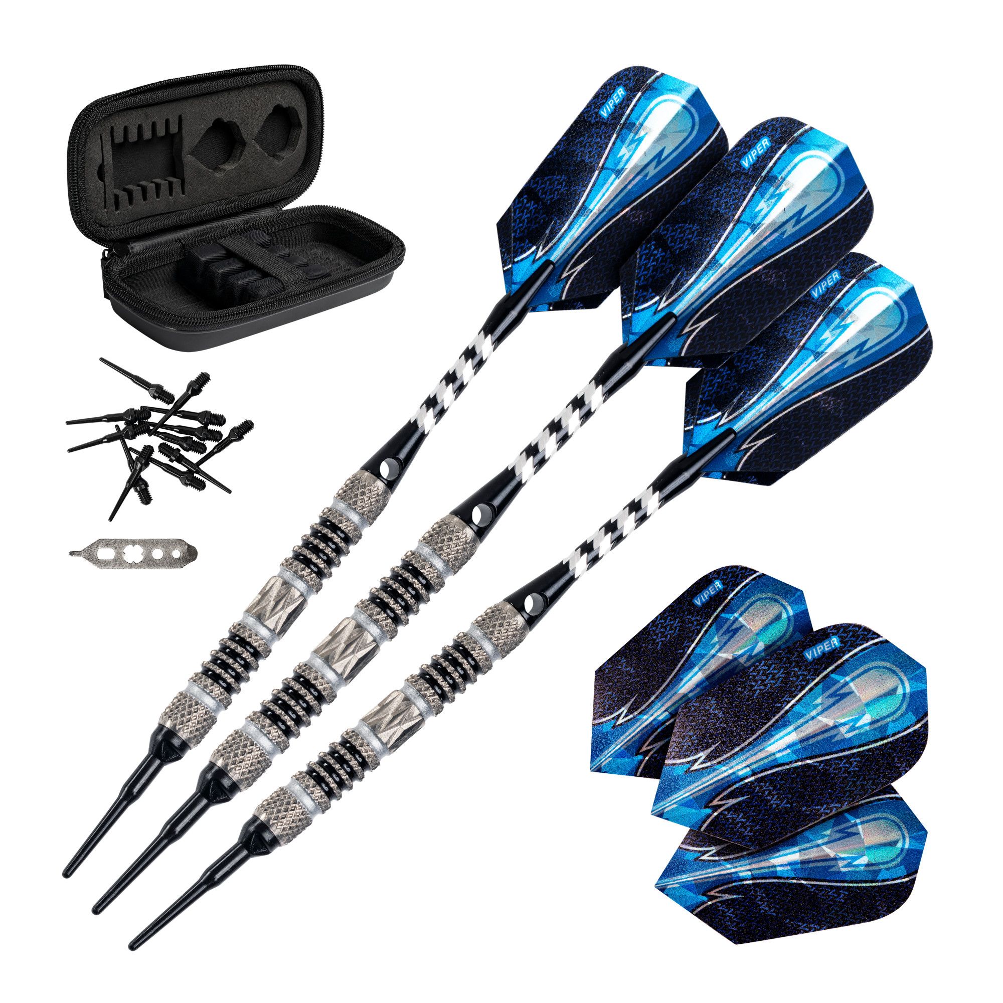Get the lightweight performance you need to take your dart game to the next level when you use the Viper® Astro Tungsten Soft Tip Darts. Diamond cut barrels and shafts ensure a precise shot that slices through the air and firmly sticks in the board. The darts come with a case and extras so you’ll always be ready for a game, while the cool hand-painted grooves add a layer of unique style.