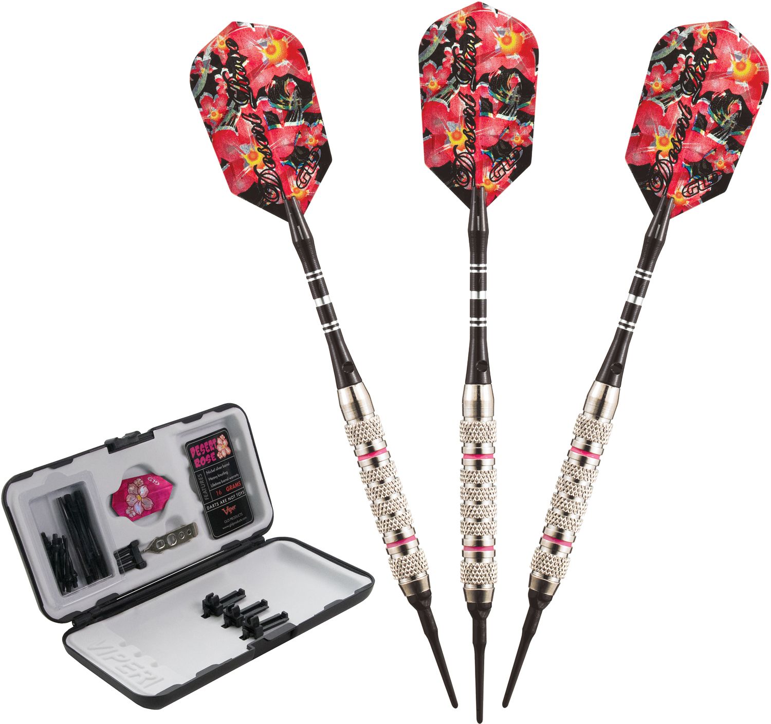 Combine elegant style with fearsome performance when you step to the line using the Viper® Desert Rose 16g Soft Tip Darts. The master shafts nickel silver barrels provide lightweight performance game after game, while the hand-painted pink rings and glitter flights add a charming layer of style. This set includes three darts, flight protectors, extra tips, a dart wrench for easy adjustments and a deluxe case for convenient storage.
