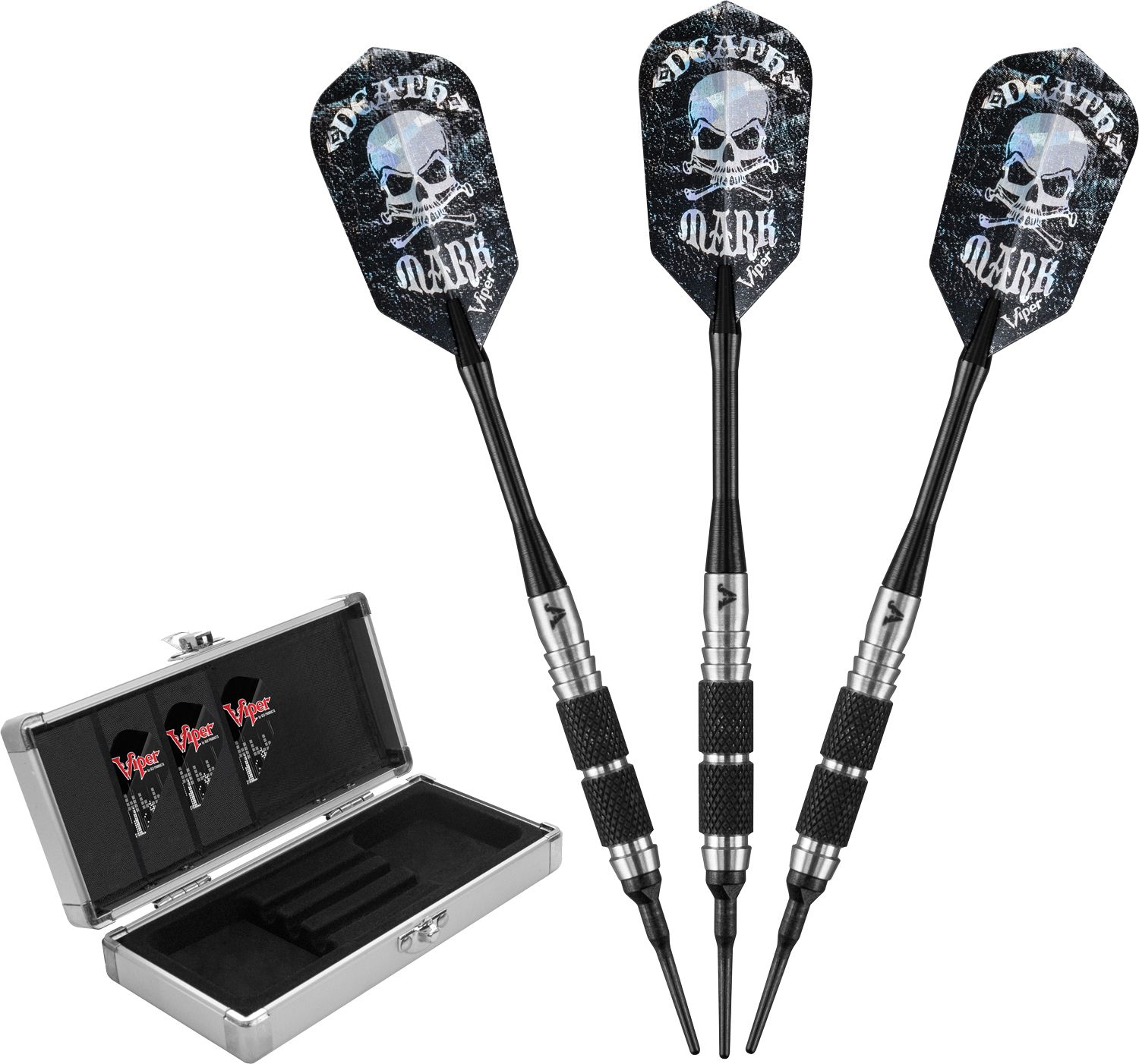 Crush the competition with Viper Desperado Tungsten 18g Death Mark Knurled Ring Soft Tip Darts. Featuring a 80% tungsten barrel and aluminum shaft for reliable strength, these darts will stand up to round after round of action. The included TacTech case keeps your darts safe and secure until game time. Nail your shots with the Viper® Desperado Darts.
