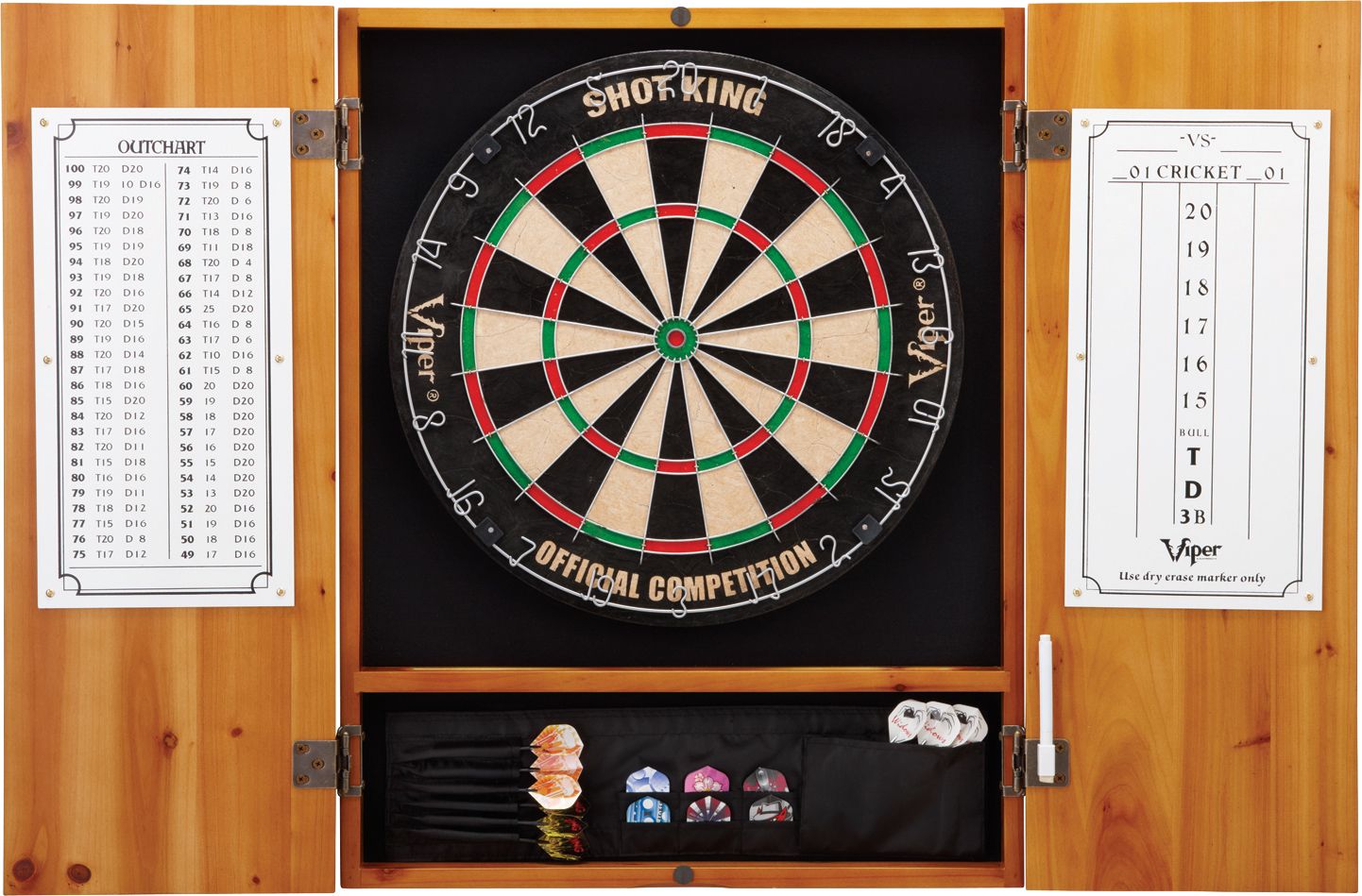 Whether you’re outfitting your man cave or rec room, the Viper® Metropolitan Oak Steel Tip Dartboard Cabinet is sure to increase your dart fun. This dartboard cabinet is designed for use with most traditional sisal fiber steel-tip dartboards and is made of solid pine with an oak finish. The black felt backing inside the cabinet prevents damage from stray darts while the lower storage area keeps your accessories organized and accessible.