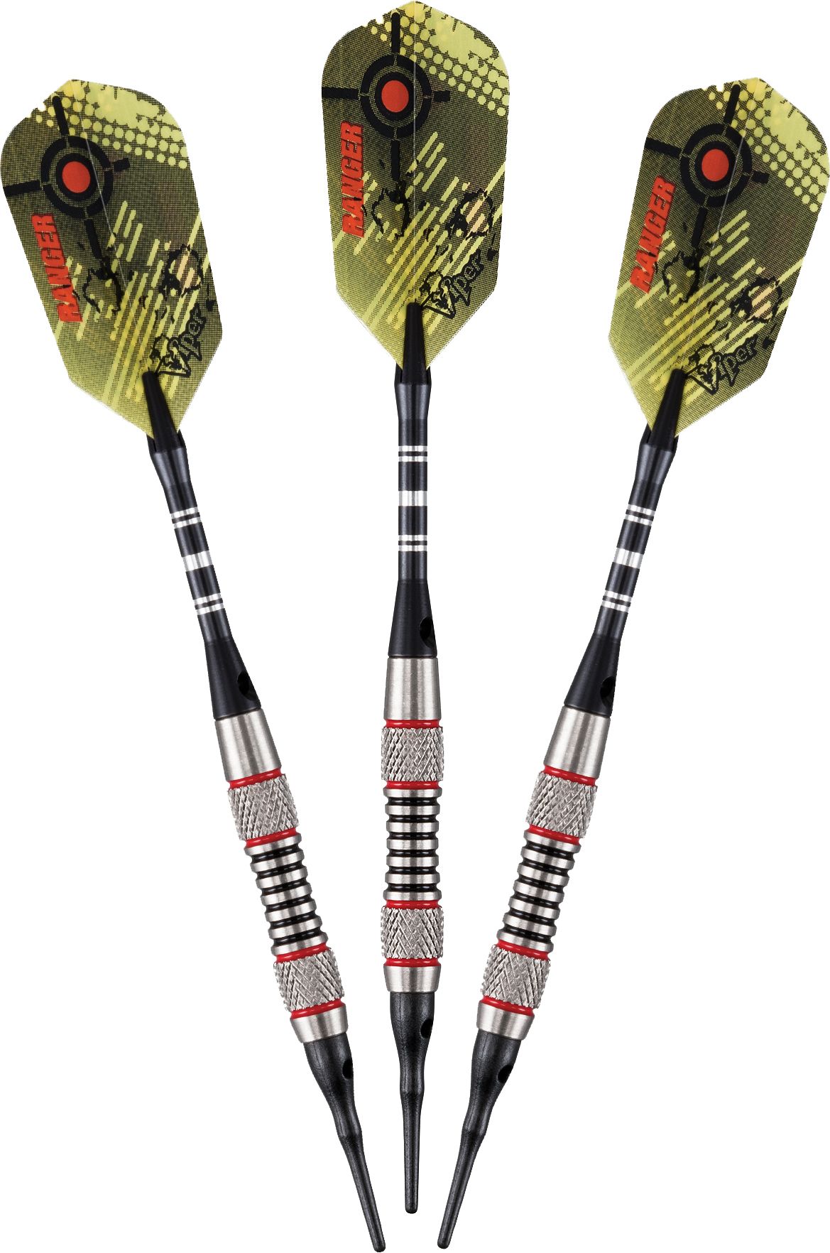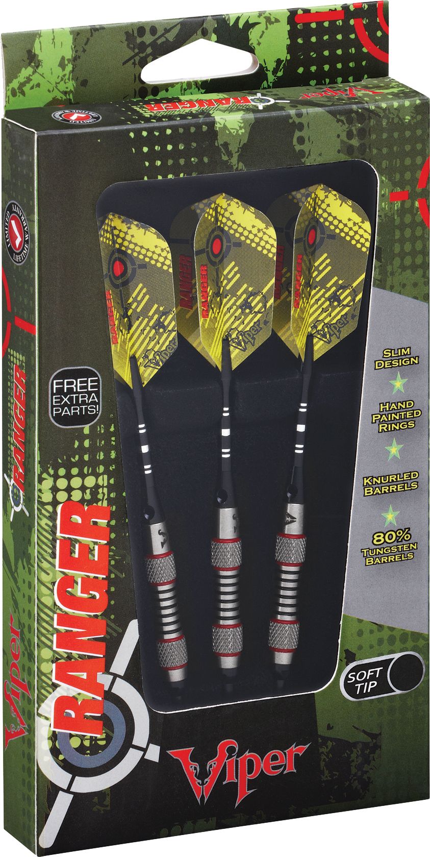 Get the lightweight zip you need to take down the competition with the Viper® Ranger 18g Tungsten Soft Tip Darts. Featuring 80% tungsten barrels and aluminum shafts for years of durability and performance, these darts will quickly become your go-to set. The Polyroyal flights effortlessly glide through the air towards the target, while the included display box keeps your items safe and together.