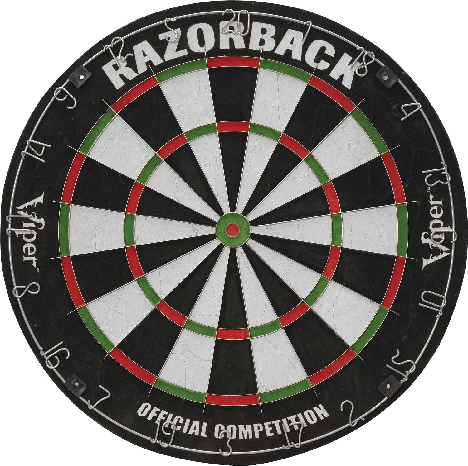 Complete your game room with the classic style and fun of the Viper® Razorback Bristle Dartboard. Utilizing a sisal construction with “self-healing” properties for premium durability and a low-glare number ring to further extend the board’s life, you’ll enjoy many years of darts games. The razor wires are staple-free to reduce the number of bounce-outs, while the included mounting hardware makes installation a snap.