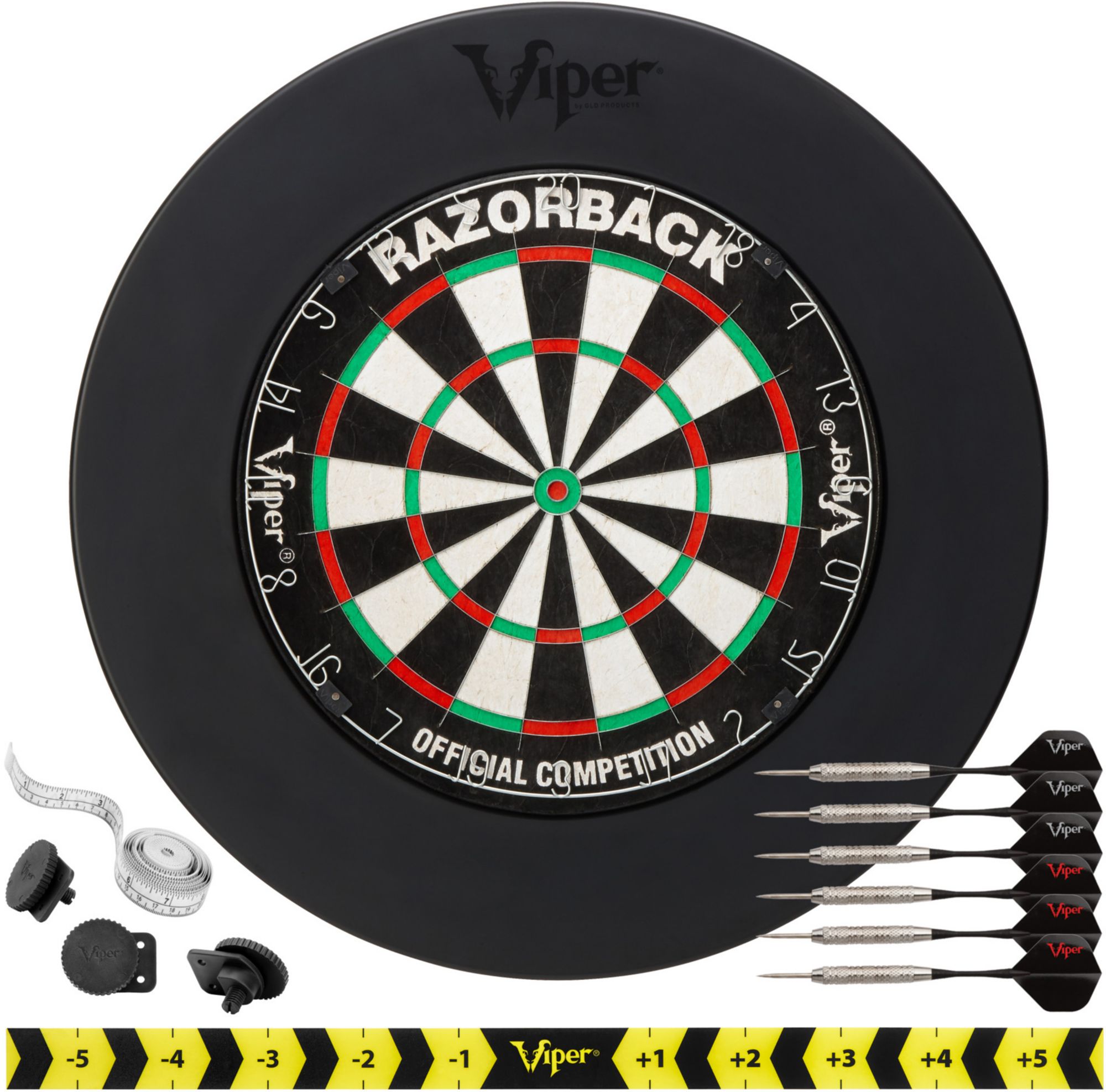 This ready-to-play dartboard set includes the Viper Razorback Dartboard and the Viper Guardian Dartboard Surround, black
