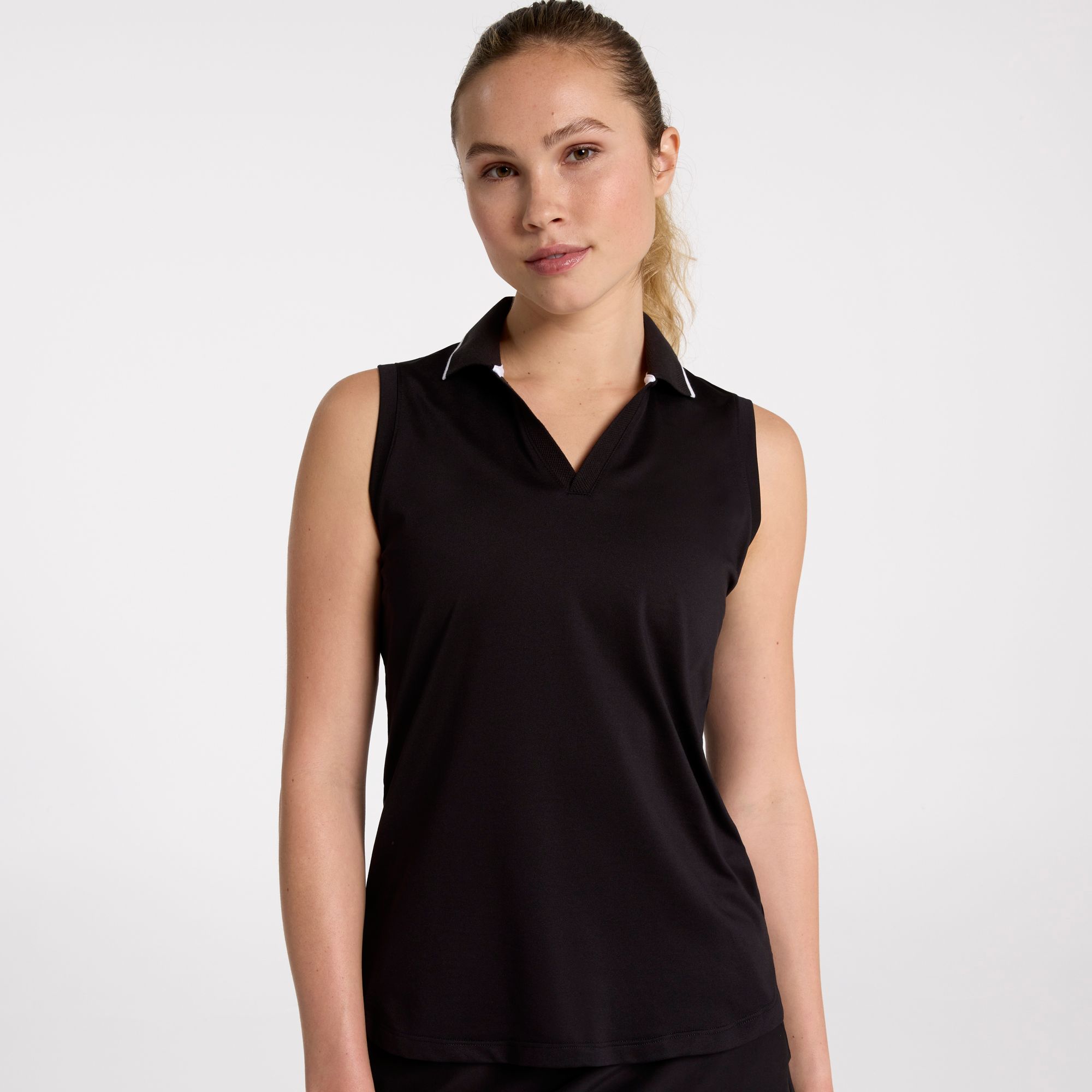 Elevate your golf game and style with the Walter Hagen Women's Performance 11 Sleeveless Johnny Polo. Designed with a V-neck collar and sleeveless cut, this polo offers a chic and sporty look. Featuring moisture-wicking technology, breathable construction, and 4-way stretch fabric, it ensures you stay cool, comfortable, and unrestricted with every swing.