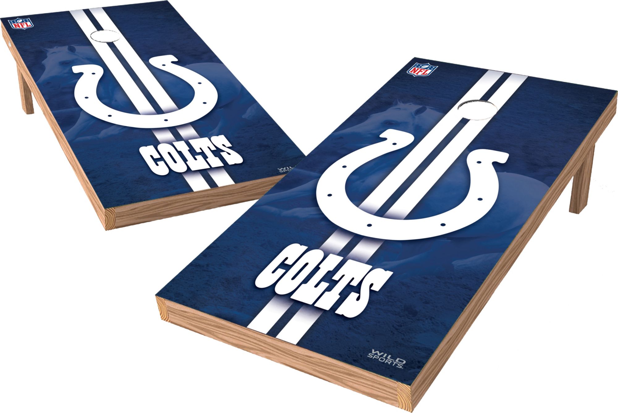 Get ready for game time playing with the Wild Sports® Indianapolis Colts XL Tailgate Bean Bag Toss Shields. In the backyard or outside the stadium, these regulation-sized boards with Colts graphics will show off your team pride in a big way. The boards are designed with collapsible legs and come with 16 oz. bean bags made with durable duck cloth for competitive play. Be sure to bring this fan favorite to your next outdoor event.