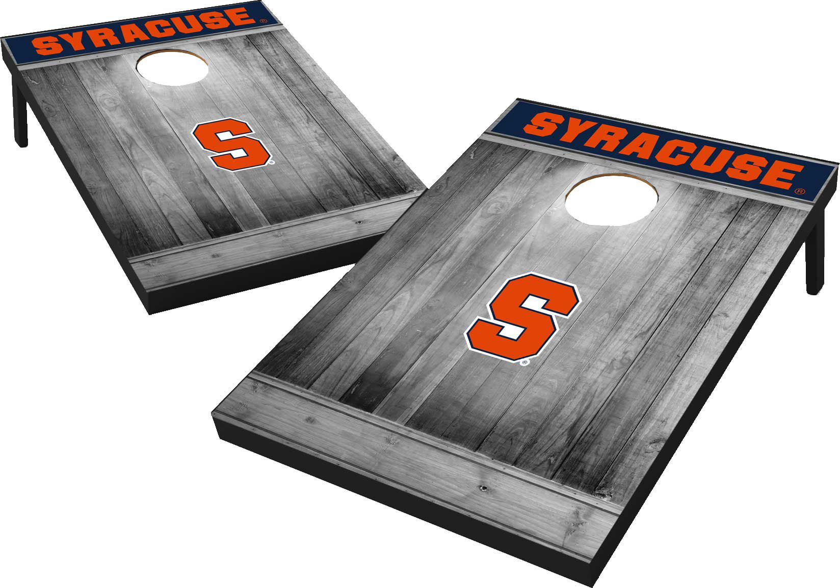Bring the spirit of your favorite college team to your tailgate with the Wild Sports Syracuse Orange Tailgate Toss. This cornhole set features two boards with grey wood finish and the team’s logo. Each board has foldable legs and a carrying handle so it is ideal for transporting from backyard to tailgate and back again. It includes eight bean bags and game instructions.